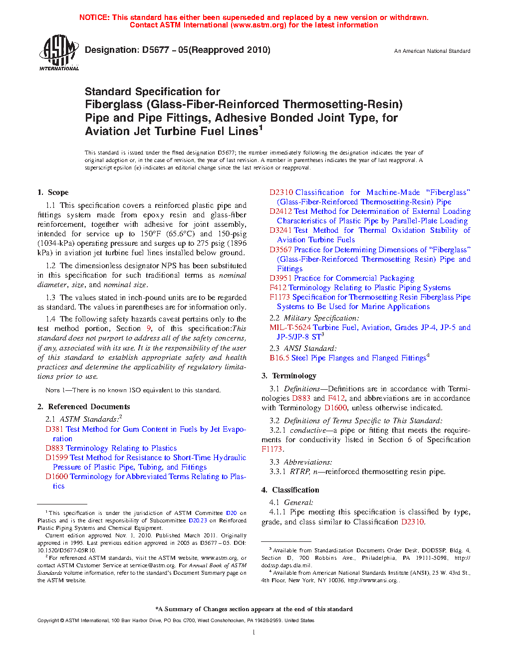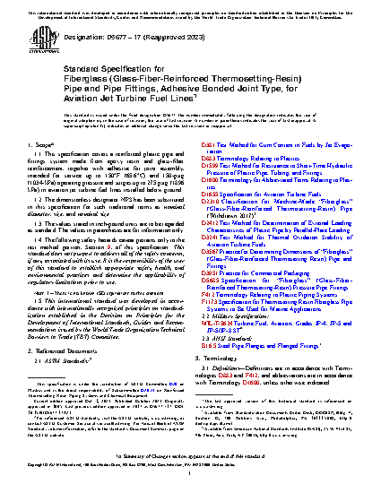 1.1 This specification covers a reinforced plastic pipe and fittings system made from epoxy resin and glass-fiber reinforcement, together with adhesive for joint assembly, intended for service up to 150°F (65.6°C) and 150-psig (1034-kPa) operating pressure and surges up to 275 psig (1896 kPa) in aviation jet turbine fuel lines installed below ground.
