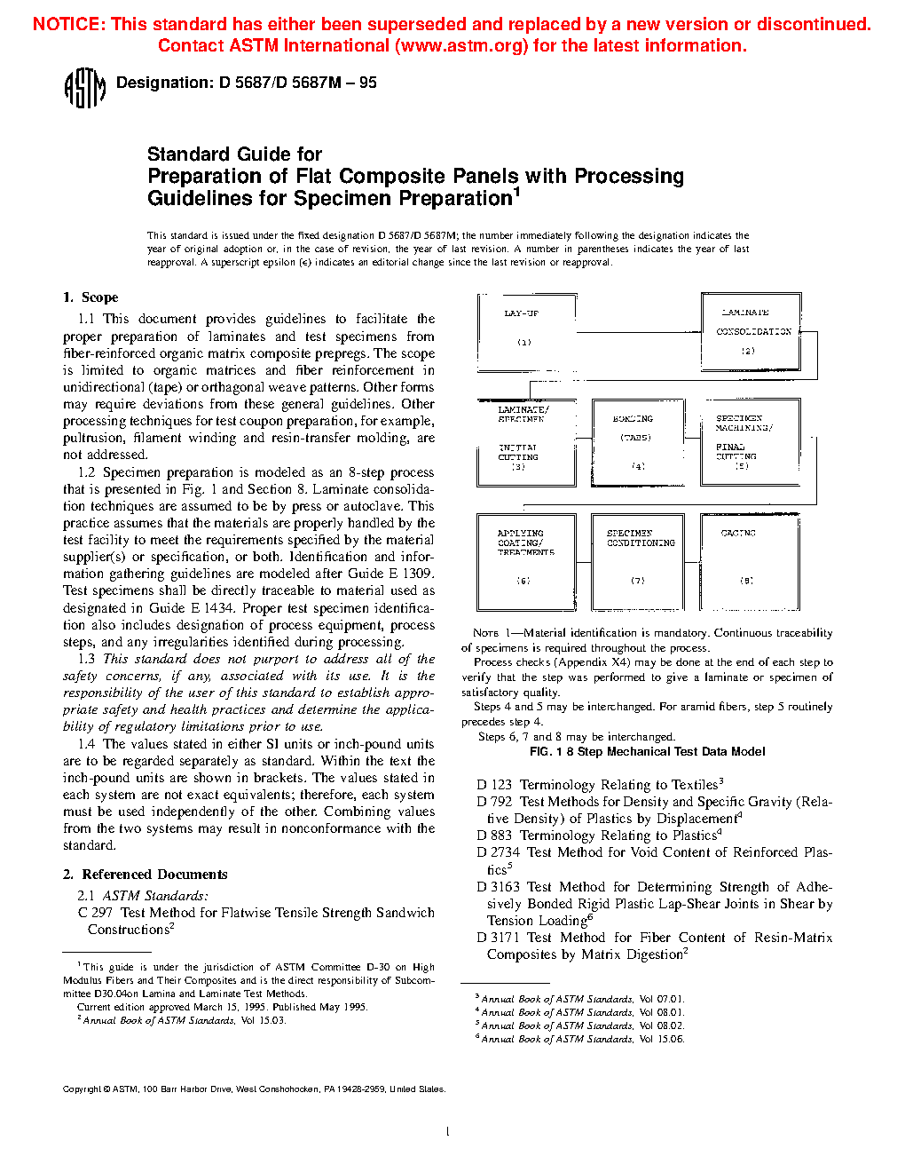 1.2 Specimen preparation is modeled as an 8-step process that is presented in Fig. 1 and Section 8. Laminate consolidation techniques are assumed to be by press or autoclave. This practice assumes that the materials are properly handled by the test facility to meet the requirements specified by the material supplier(s) or specification, or both. Identification and information gathering guidelines are modeled after Guide E1309. Test specimens shall be directly traceable to material used as designated in Guide E1434. Proper test specimen identification also includes designation of process equipment, process steps, and any irregularities identified during processing.