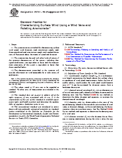 1.1 This practice covers a method for characterizing surface wind speed, wind direction, peak one-minute speeds, peak three-second and peak one-minute speeds, and standard deviations of fluctuation about the means of speed and direction.