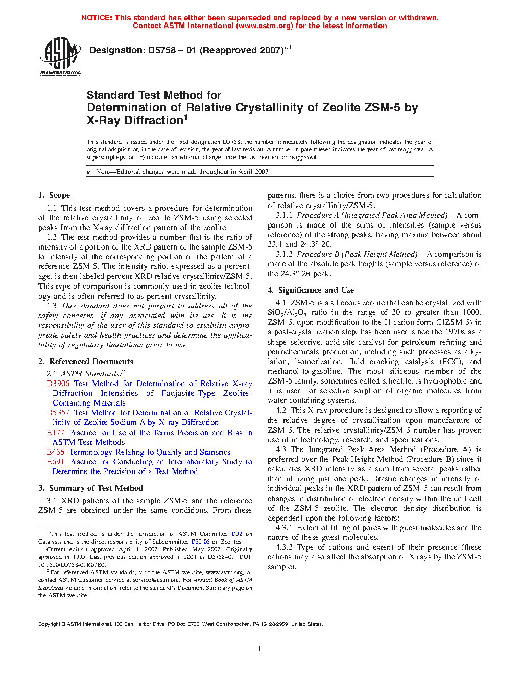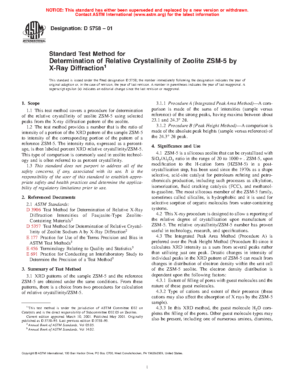 1.1 This test method covers a procedure for determination of the relative crystallinity of zeolite ZSM-5 using selected peaks from the X-ray diffraction pattern of the zeolite.