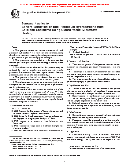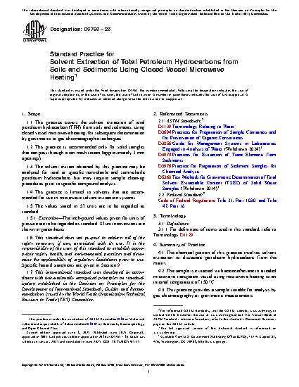 1.1 This practice covers the solvent extraction of total petroleum hydrocarbon (TPH) from soils and sediments, using closed vessel microwave heating, for subsequent determination by gravimetric or gas chromatographic techniques.