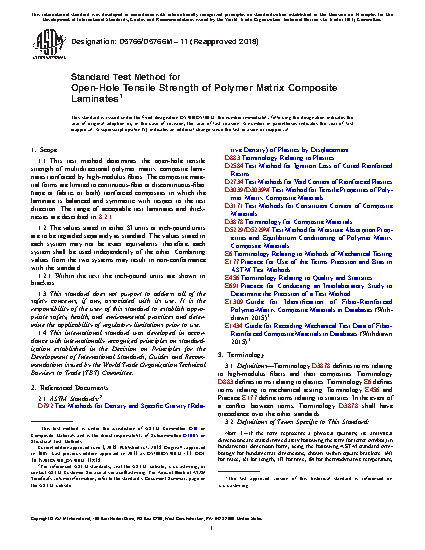 1.1 This test method determines the open hole tensile strength of multidirectional polymer matrix composite laminates reinforced by high-modulus fibers. The composite material forms are limited to continuous-fiber or discontinuous-fiber (tape or fabric, or both) reinforced composites in which the laminate is balanced and symmetric with respect to the test direction. The range of acceptable test laminates and thicknesses are described in 8.2.1.