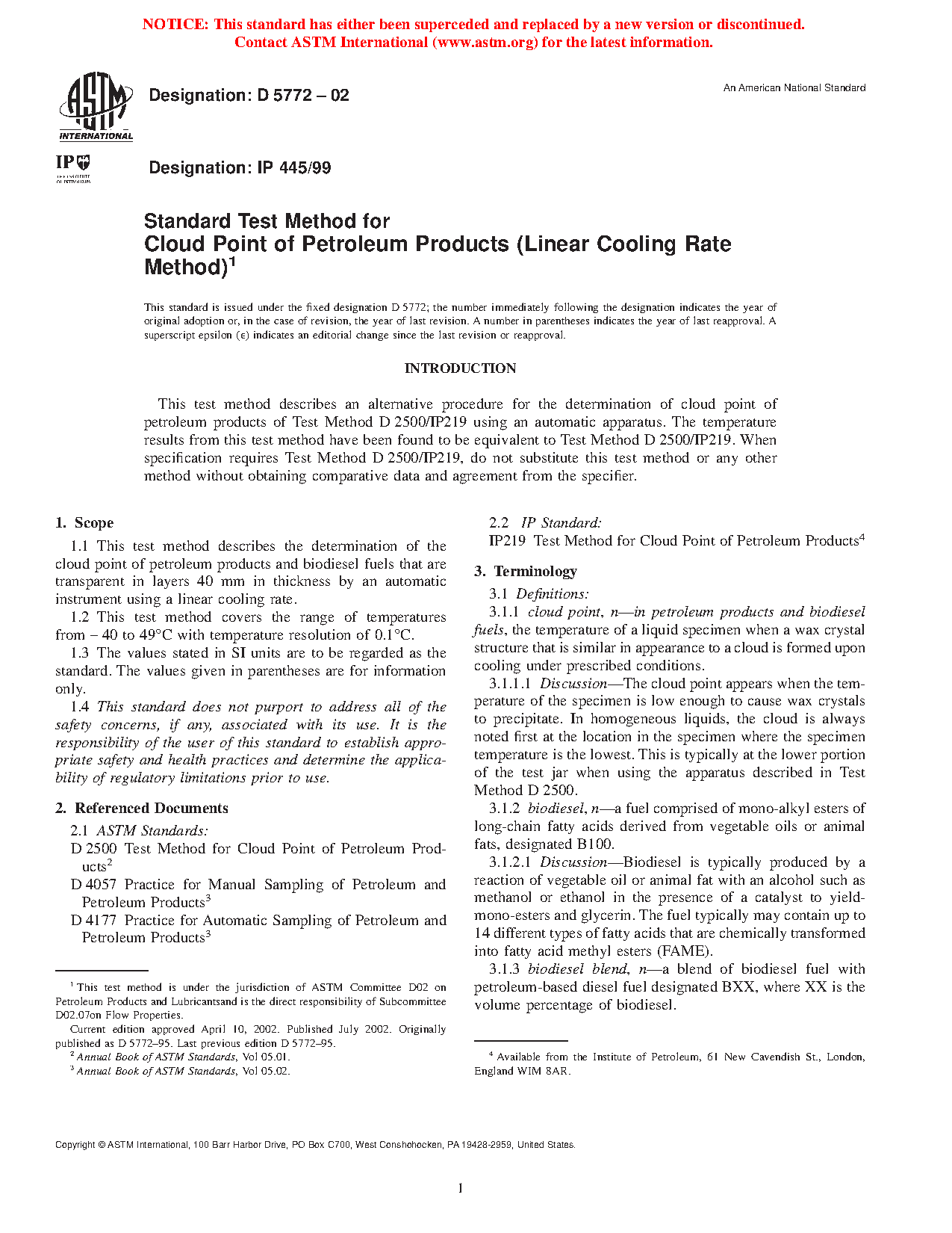 1.1 This test method describes the determination of the cloud point of petroleum products that are transparent in layers 40 mm in thickness by an automatic instrument using a linear cooling rate.