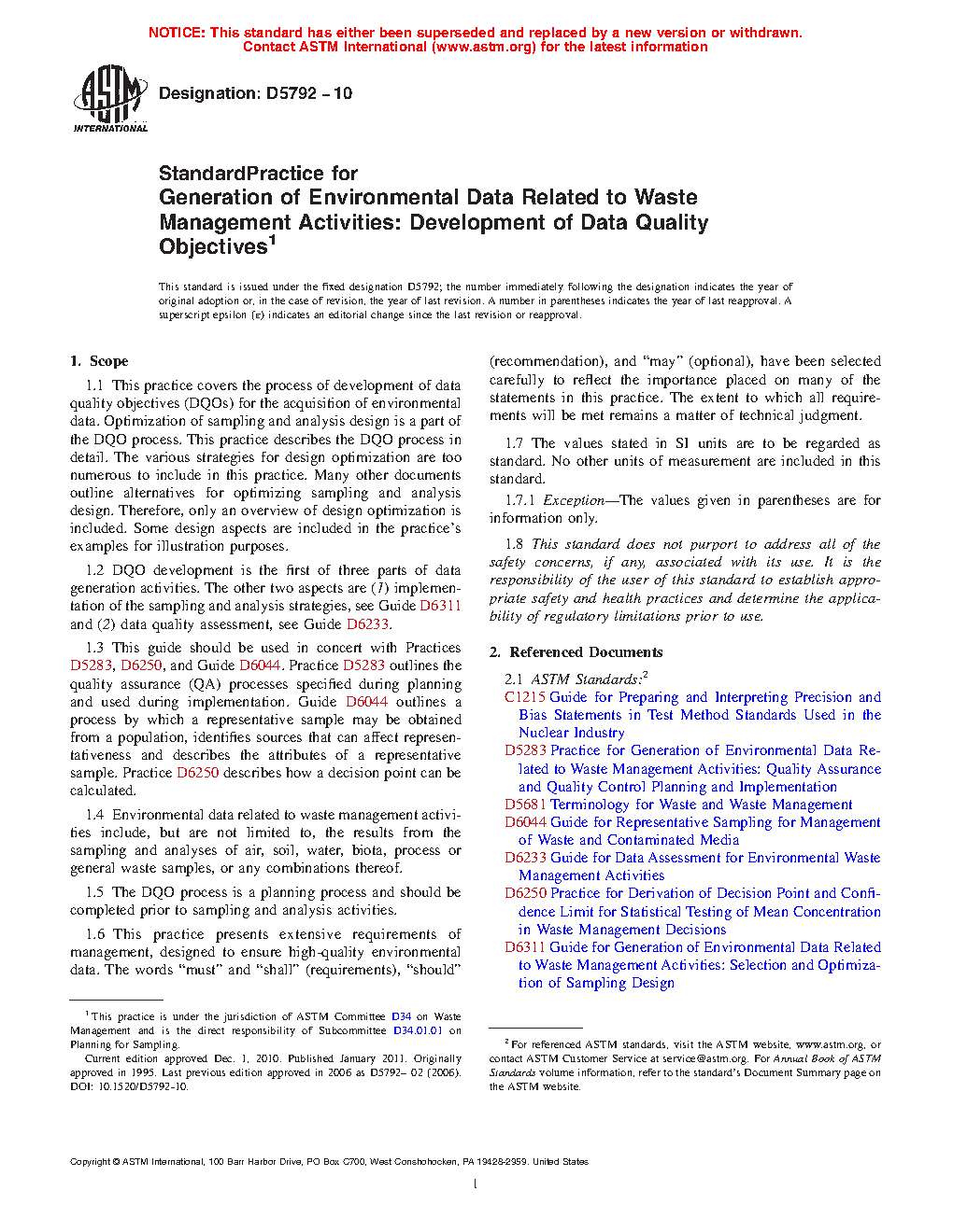 1.3 This guide should be used in concert with Practices D5283, D6250, and Guide D6044. Practice D5283 outlines the quality assurance (QA) processes specified during planning and used during implementation. Guide D6044 outlines a process by which a representative sample may be obtained from a population, identifies sources that can affect representativeness, and describes the attributes of a representative sample. Practice D6250 describes how a decision point can be calculated.