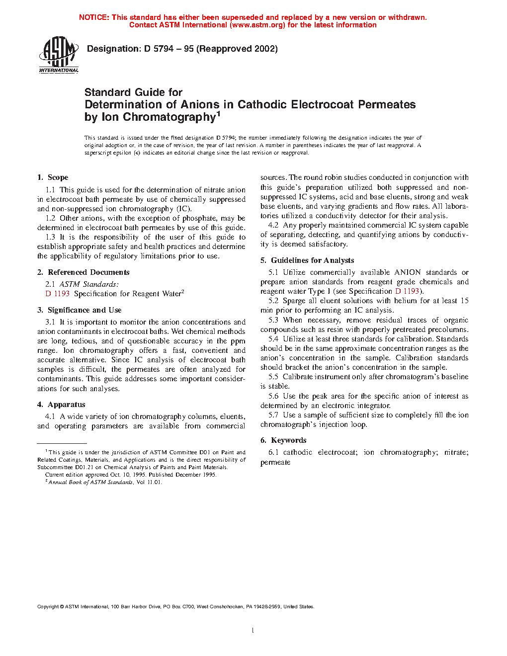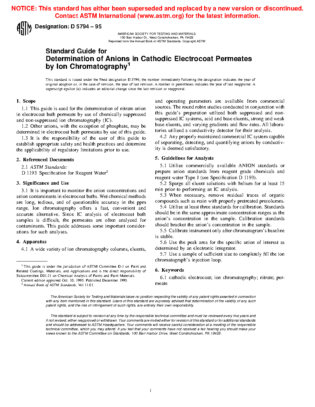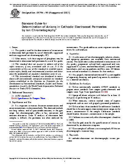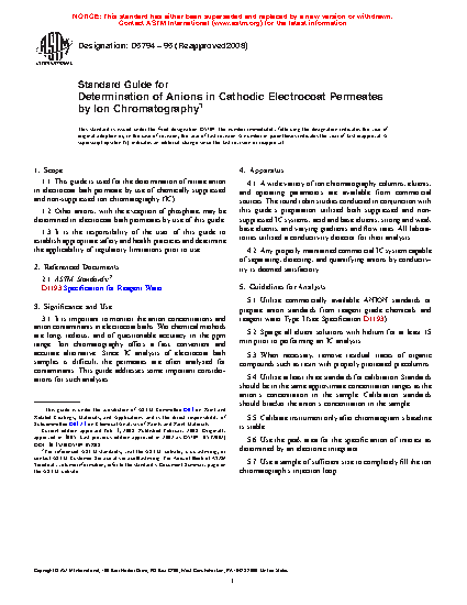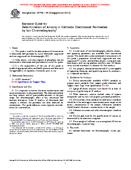 1.1 This guide is used for the determination of nitrate anion in electrocoat bath permeate by use of chemically suppressed and non-suppressed ion chromatography (IC).