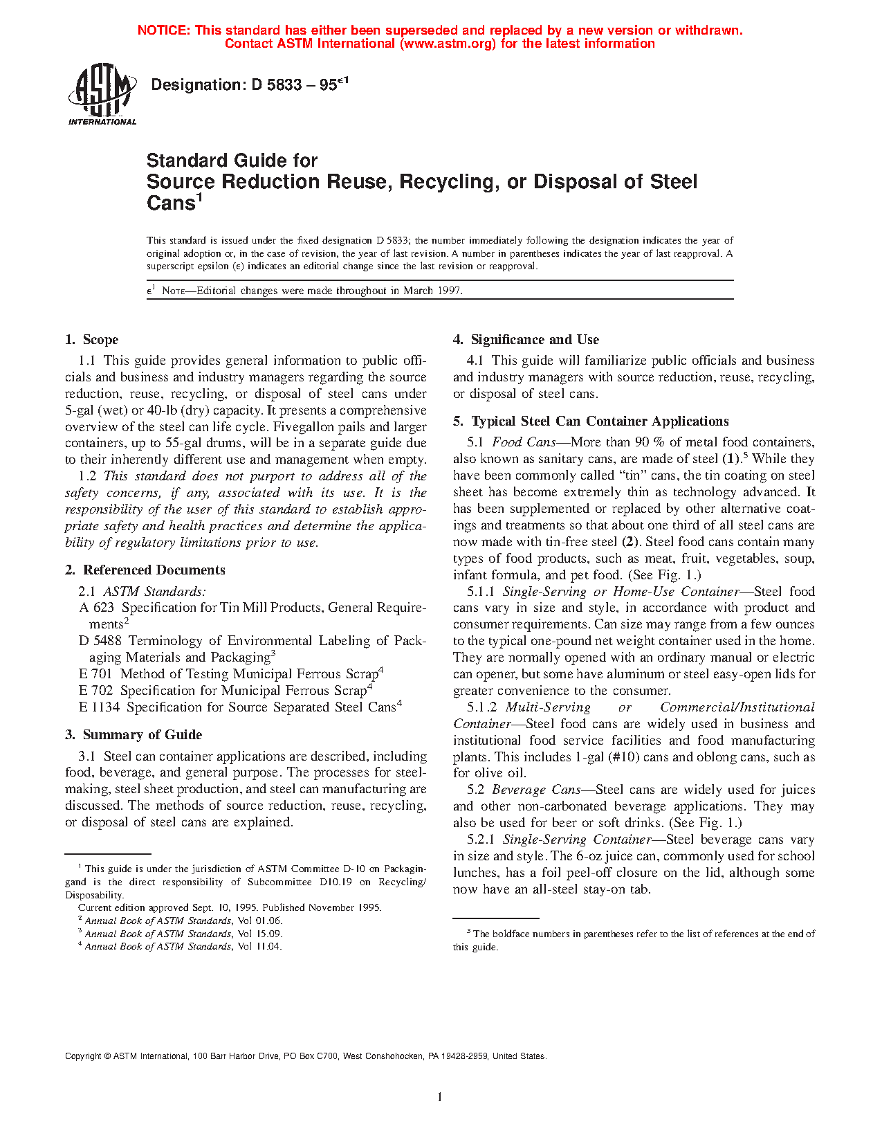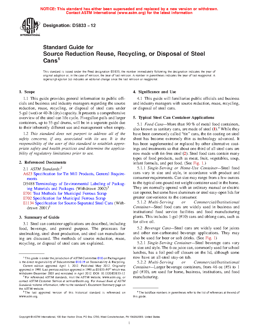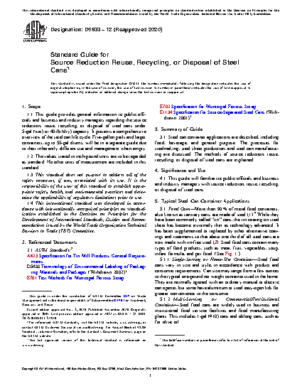 1.1 This guide provides general information to public officials and business and industry managers regarding the source reduction, reuse, recycling, or disposal of steel cans under 5-gal (wet) or 40-lb (dry) capacity. It presents a comprehensive overview of the steel can life cycle. Fivegallon pails and larger containers, up to 55-gal drums, will be in a separate guide due to their inherently different use and management when empty.