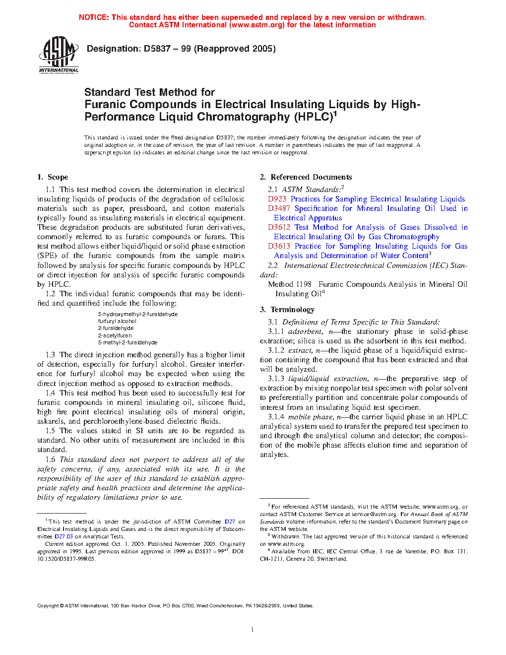 1.1 This test method covers the determination in electrical insulating liquids of products of the degradation of cellulosic materials such as paper, pressboard, and cotton materials typically found as insulating materials in electrical equipment. These degradation products are substituted furan derivatives, commonly referred to as furanic compounds or furans. This test method allows either liquid/liquid or solid phase extraction (SPE) of the furanic compounds from the sample matrix followed by analysis for specific furanic compounds by HPLC or direct injection for analysis of specific furanic compounds by HPLC.