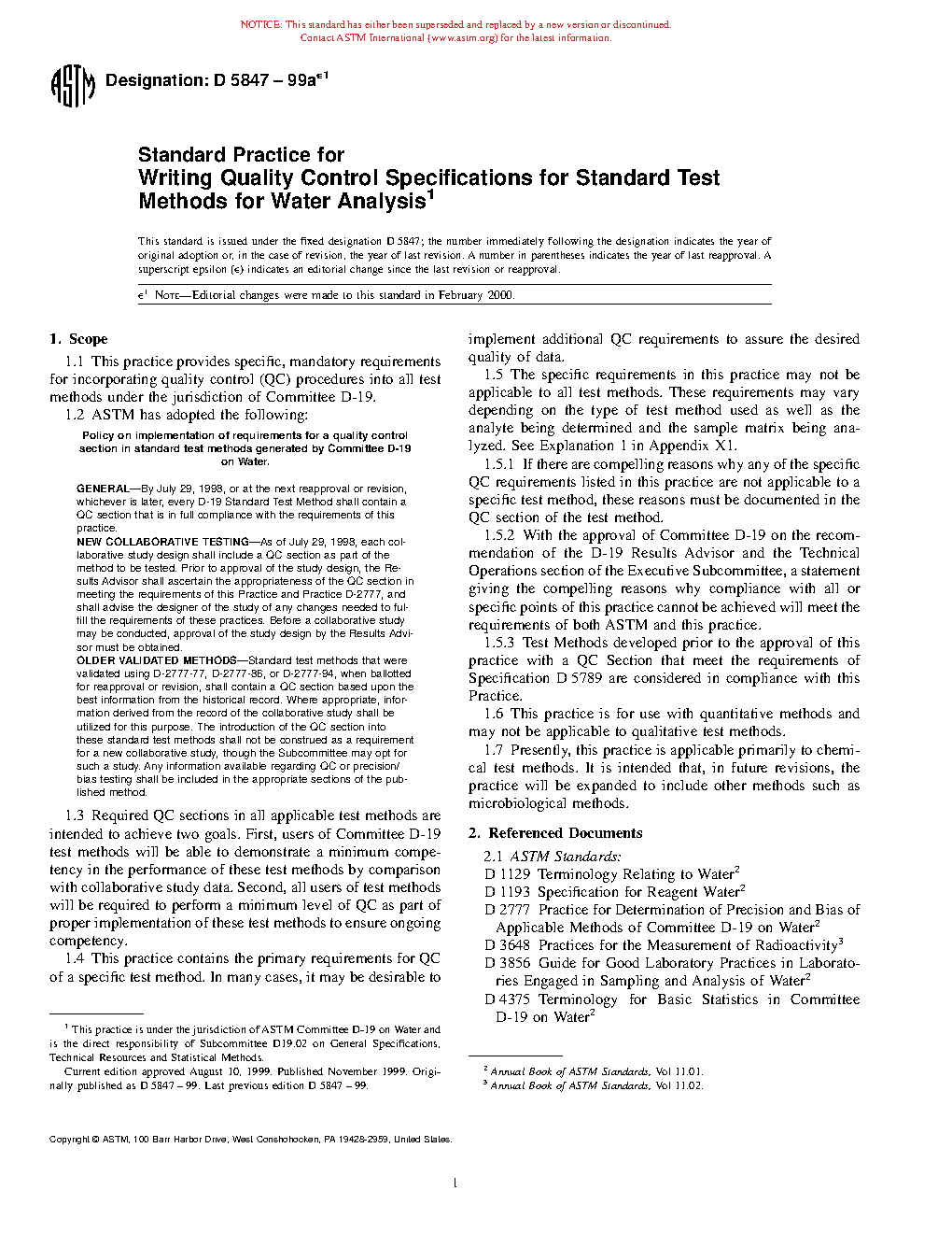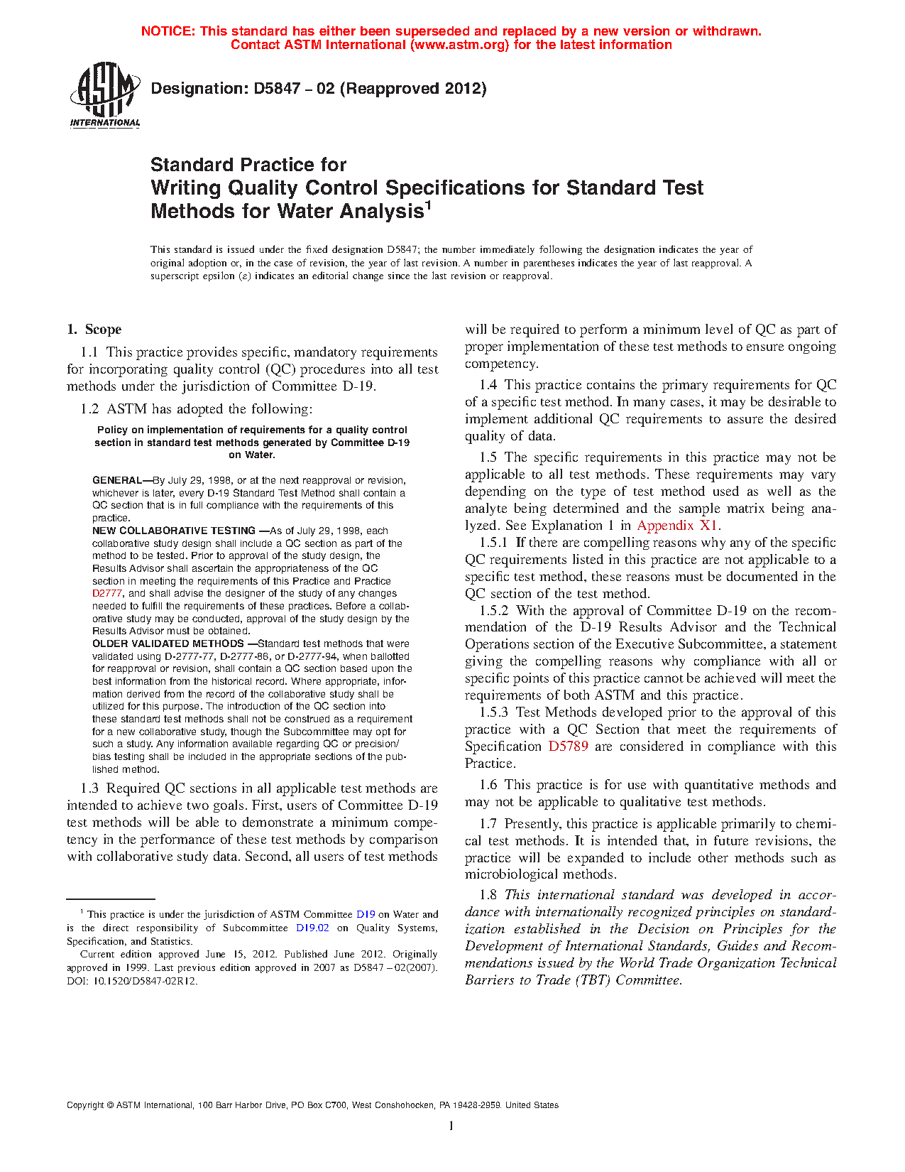 | Policy on implementation of requirements for a quality control section in standard test methods generated by Committee D-19 on Water. | |