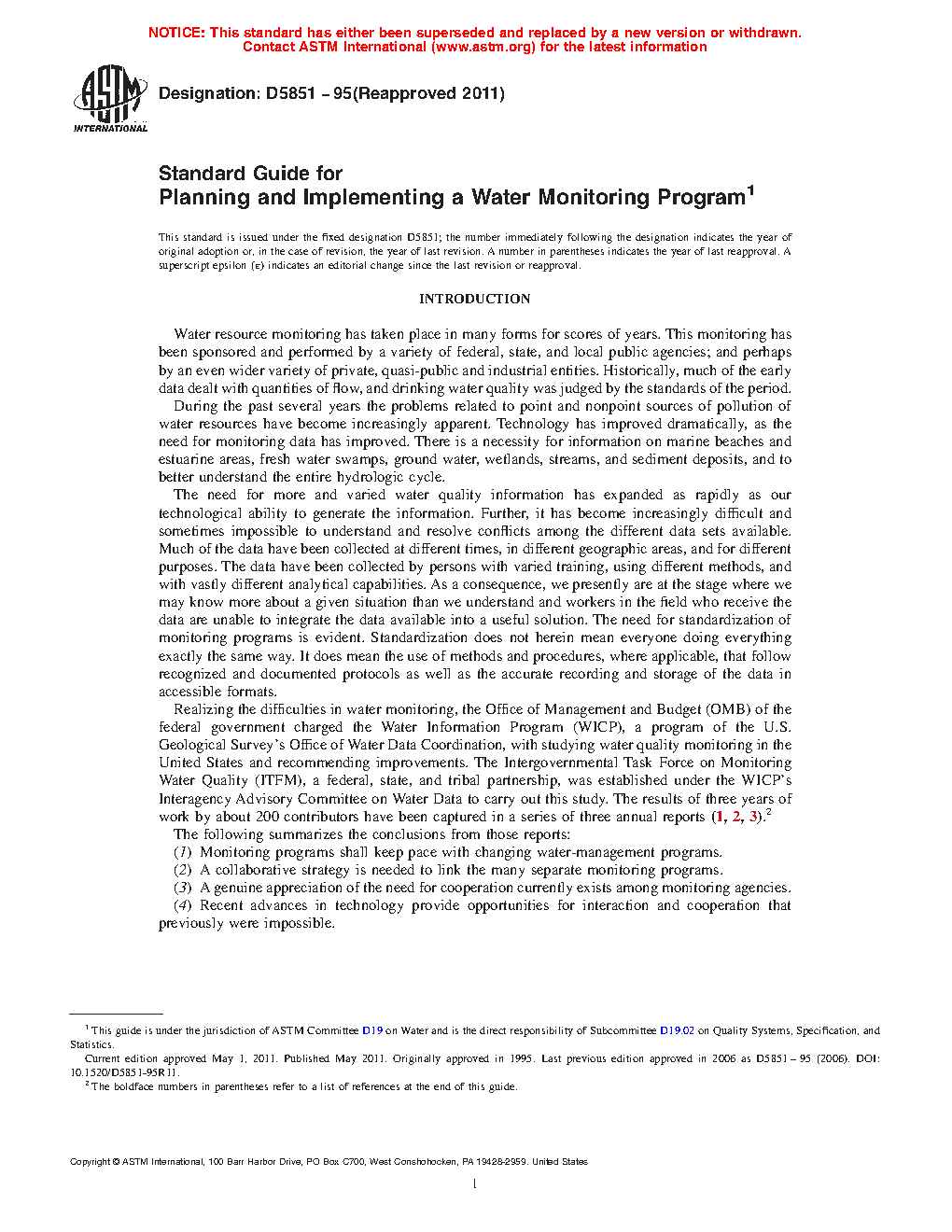 1.4 Monitoring Components—A water monitoring program is composed of a set of activities, practices, and procedures designed to collect reliable information of known accuracy and precision concerning a particular water resource in order to achieve a specific goal or purpose. The purposes may range in scope from tracking status and trends on a regional or national basis to gathering data to determine the effects of a specific management practice or pollution incident such as a spill. This guide suggests and discusses the following process and components: