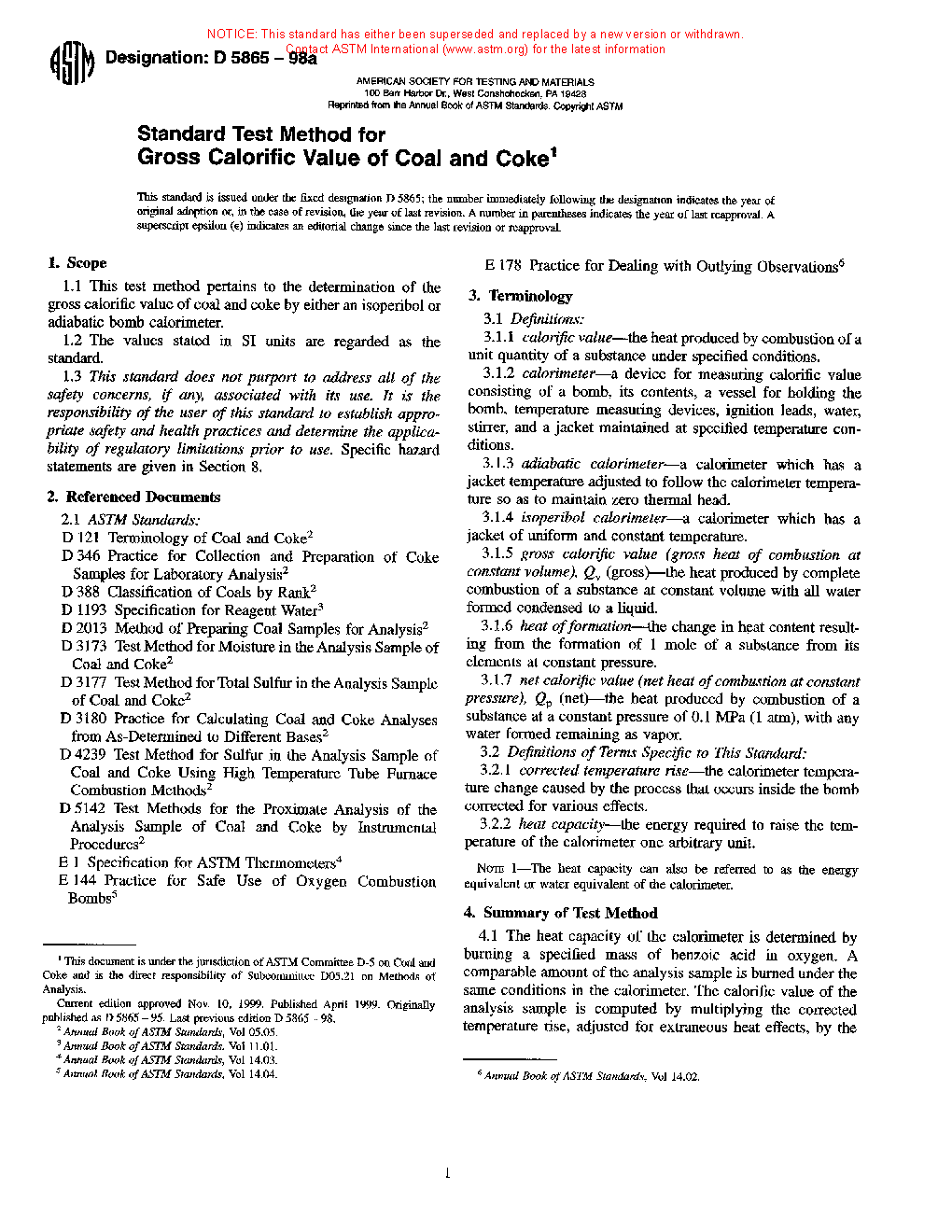 1.1 This test method pertains to the determination of the gross calorific value of coal and coke by either an isoperibol or adiabatic bomb calorimeter.