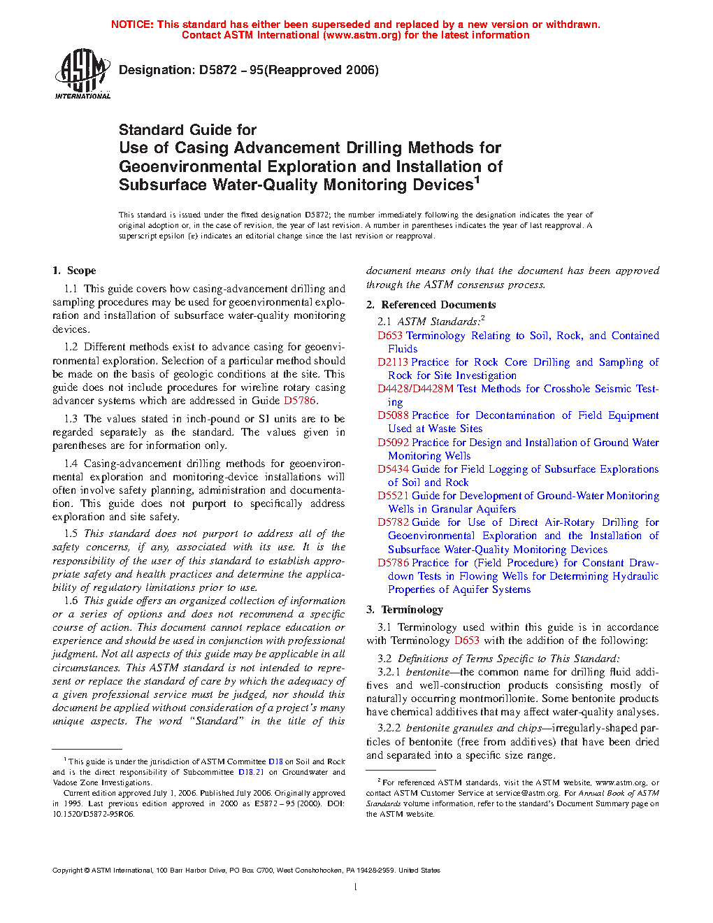1.2 Different methods exist to advance casing for geoenvironmental exploration. Selection of a particular method should be made on the basis of geologic conditions at the site. This guide does not include procedures for wireline rotary casing advancer systems which are addressed in Guide D5786.
