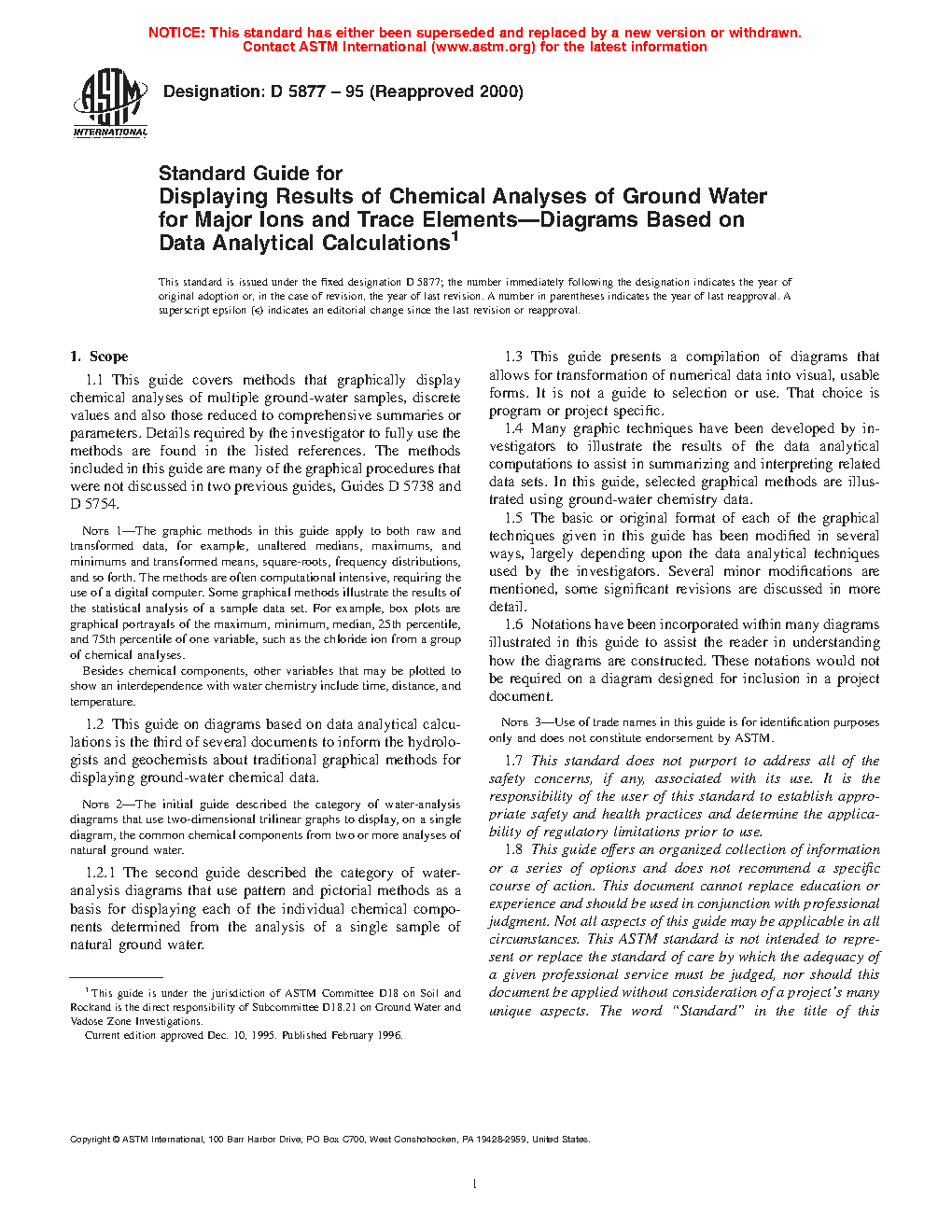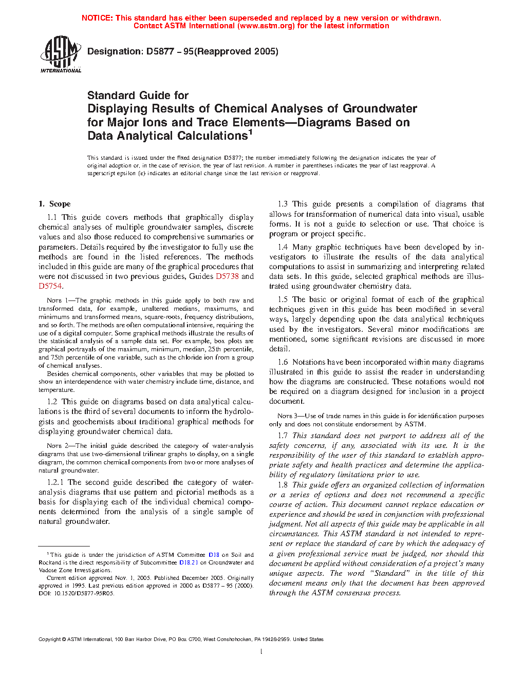 1.1 This guide covers methods that graphically display chemical analyses of multiple ground-water samples, discrete values and also those reduced to comprehensive summaries or parameters. Details required by the investigator to fully use the methods are found in the listed references. The methods included in this guide are many of the graphical procedures that were not discussed in two previous guides, Guides D5738 and D5754.