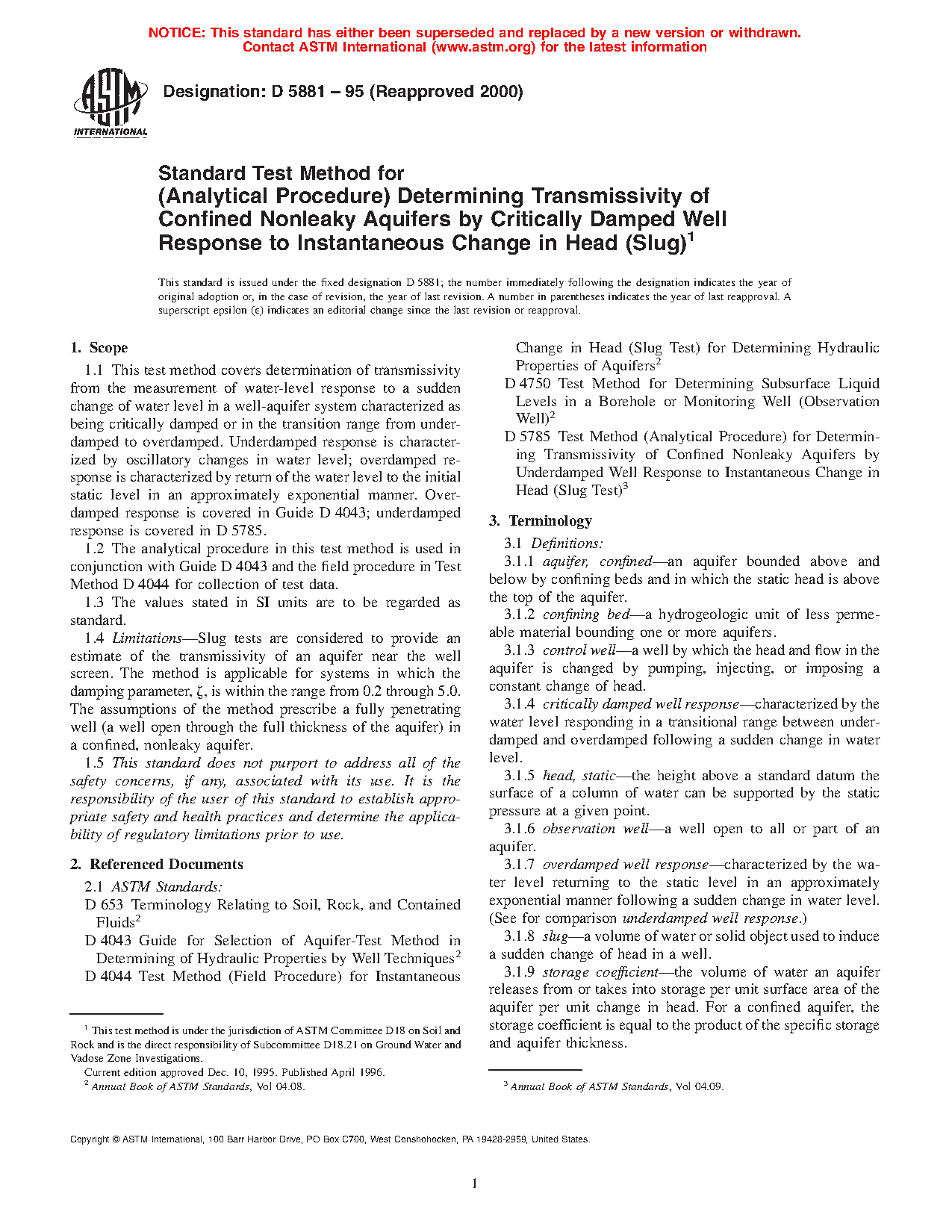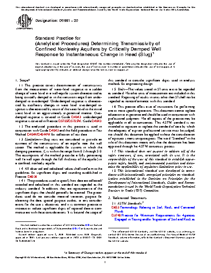 1.1 This test method covers determination of transmissivity from the measurement of water-level response to a sudden change of water level in a well-aquifer system characterized as being critically damped or in the transition range from underdamped to overdamped. Underdamped response is characterized by oscillatory changes in water level; overdamped response is characterized by return of the water level to the initial static level in an approximately exponential manner. Overdamped response is covered in Guide D4043; underdamped response is covered in D5785.