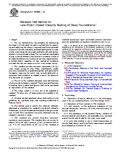 1.1 This test method covers the procedure for determining the integrity of individual vertical or inclined piles by measuring and analyzing the velocity (required) and force (optional) response of the pile induced by an (hand held hammer or other similar type) impact device applied axially to the pile normally at the pile head. This test method is applicable to long structural elements that function in a manner similar to foundation piles, regardless of their method of installation provided that they are receptive to low strain impact testing.