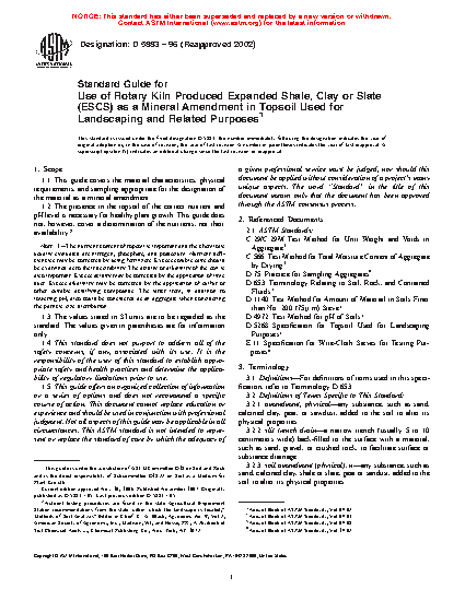 Note 1-The nutrient content of topsoil is important and the chemicals usually evaluated are nitrogen, phosphate, and potassium. Nutrient deficiencies may be corrected by using fertilizers. Excess soluble salts should be examined as to their desirability. The acidity or alkalinity of the soil is also important. Excess acidity may be corrected by the application of lime dust. Excess alkalinity may be corrected by the application of sulfur or other suitable acidifying compounds. The latter item, in addition to lowering pH, also could be considered as an aggregate when considering the particle size distribution.1.3 The values stated in SI units are to be regarded as the standard. The values given in parentheses are for information only.