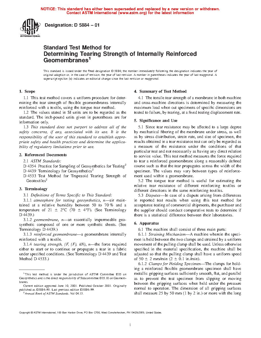 1.1 This test method covers a uniform procedure for determining the tear strength of flexible geomembranes internally reinforced with a textile, using the tongue tear method.