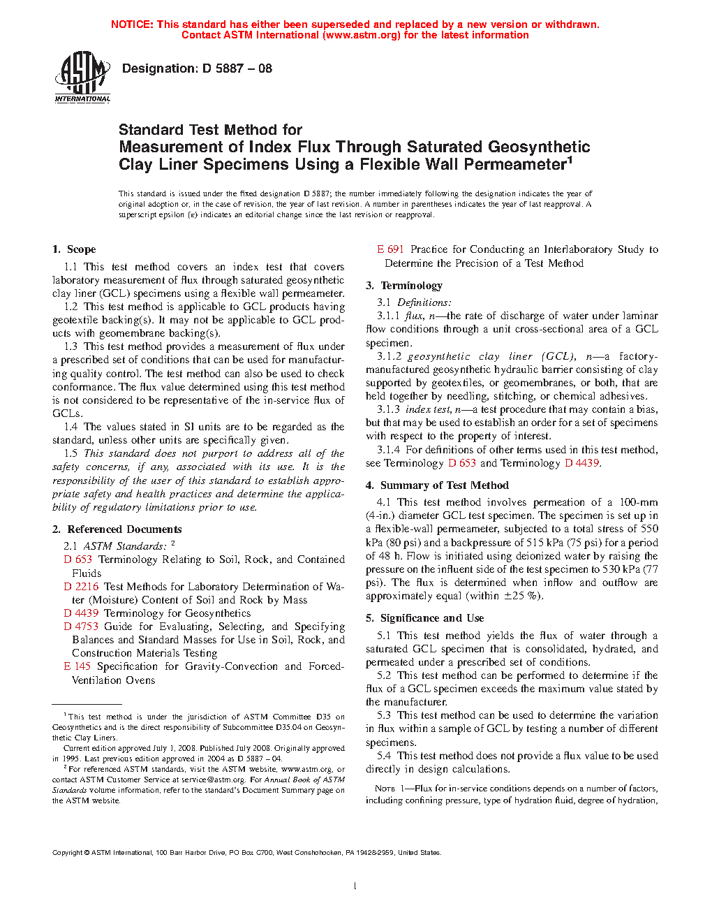 1.1 This test method is an index test that covers laboratory measurement of flux through saturated geosynthetic clay liner (GCL) specimens using a flexible wall permeameter.