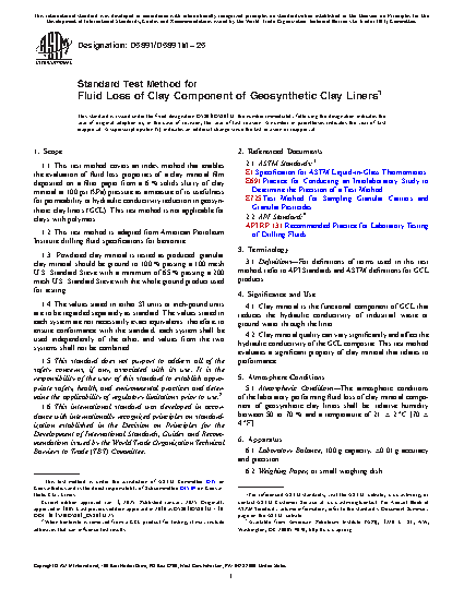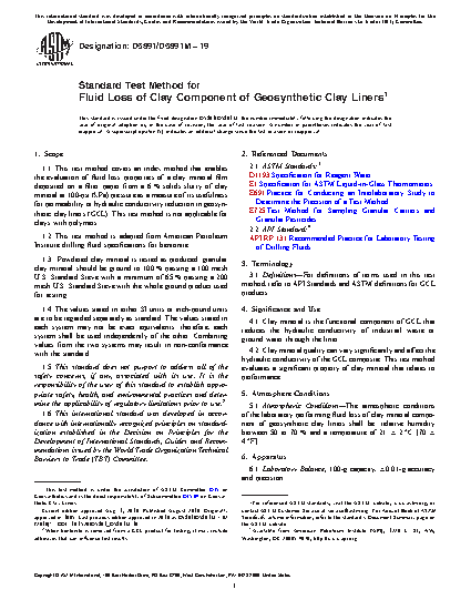 1.1 This test method covers an index method that enables the evaluation of fluid loss properties of a clay mineral film deposited on a filter paper from a 6 % solids slurry of clay mineral at 100 psi (kPa) pressure as a measure of its usefulness for permeability or hydraulic conductivity reduction in geosynthetic clay liners (GCL). This test method is not applicable for clays with polymers.