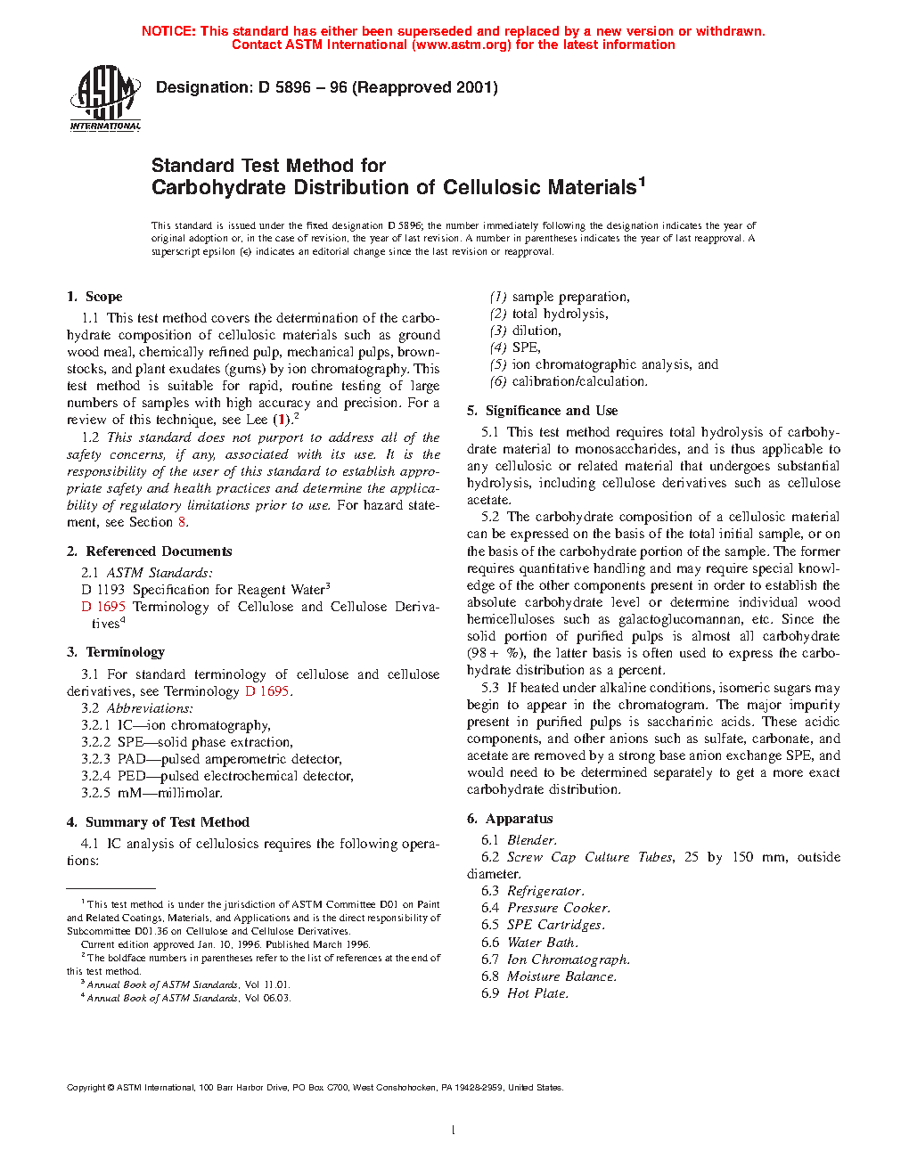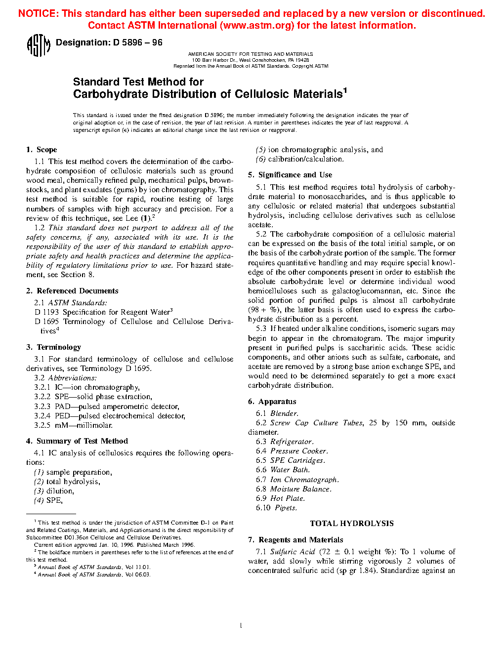 5.1 This test method requires total hydrolysis of carbohydrate material to monosaccharides, and is thus applicable to any cellulosic or related material that undergoes substantial hydrolysis, including cellulose derivatives such as cellulose acetate.