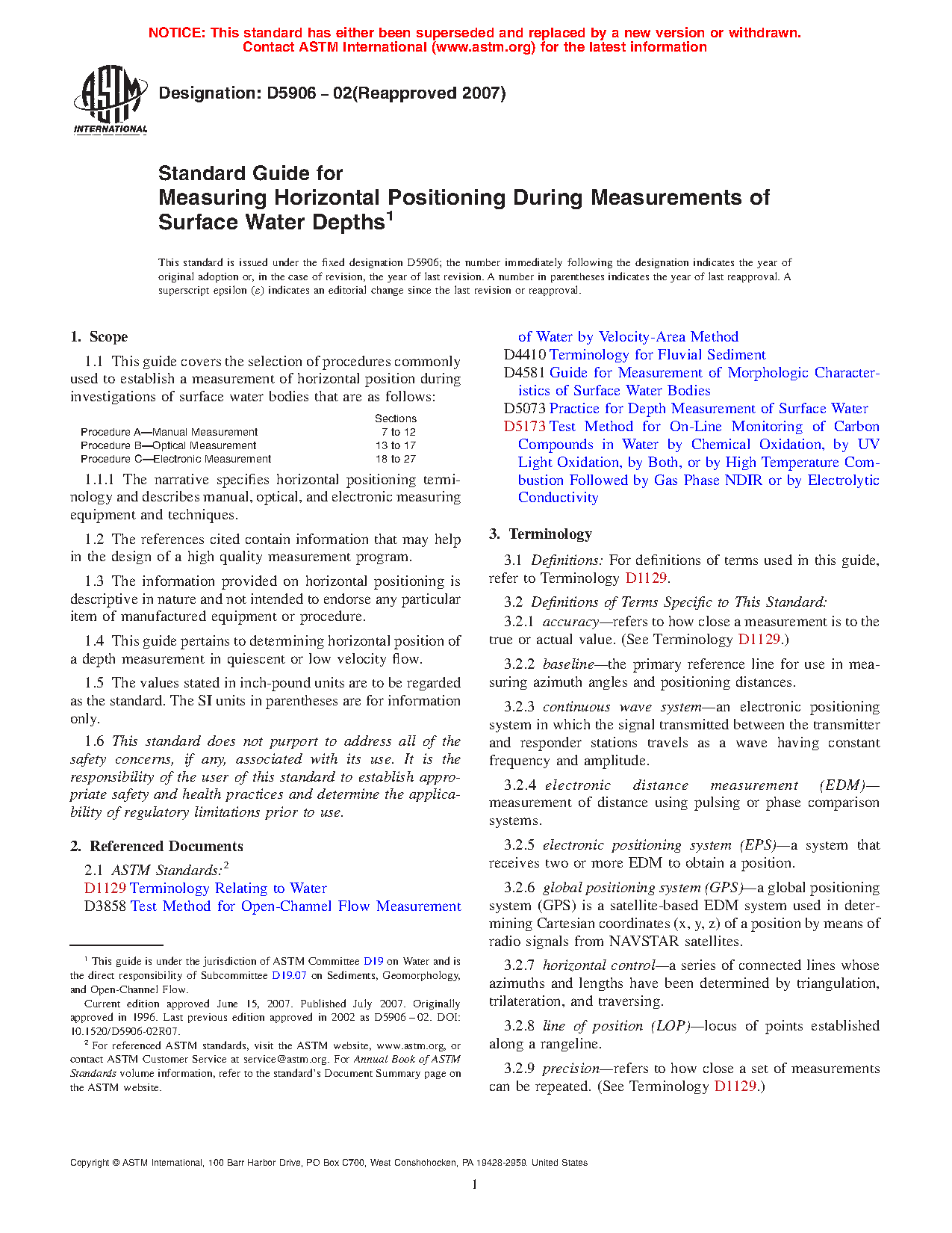 1.1 This guide covers the selection of procedures commonly used to establish a measurement of horizontal position during investigations of surface water bodies that are as follows: