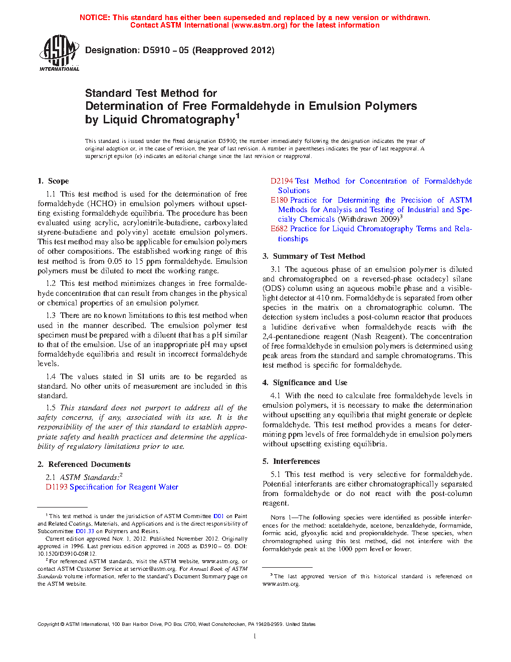 1.3 There are no known limitations to this test method when used in the manner described. The emulsion polymer test specimen must be prepared with a diluent that has a pH similar to that of the emulsion. Use of an inappropriate pH may upset formaldehyde equilibria and result in incorrect formaldehyde levels.