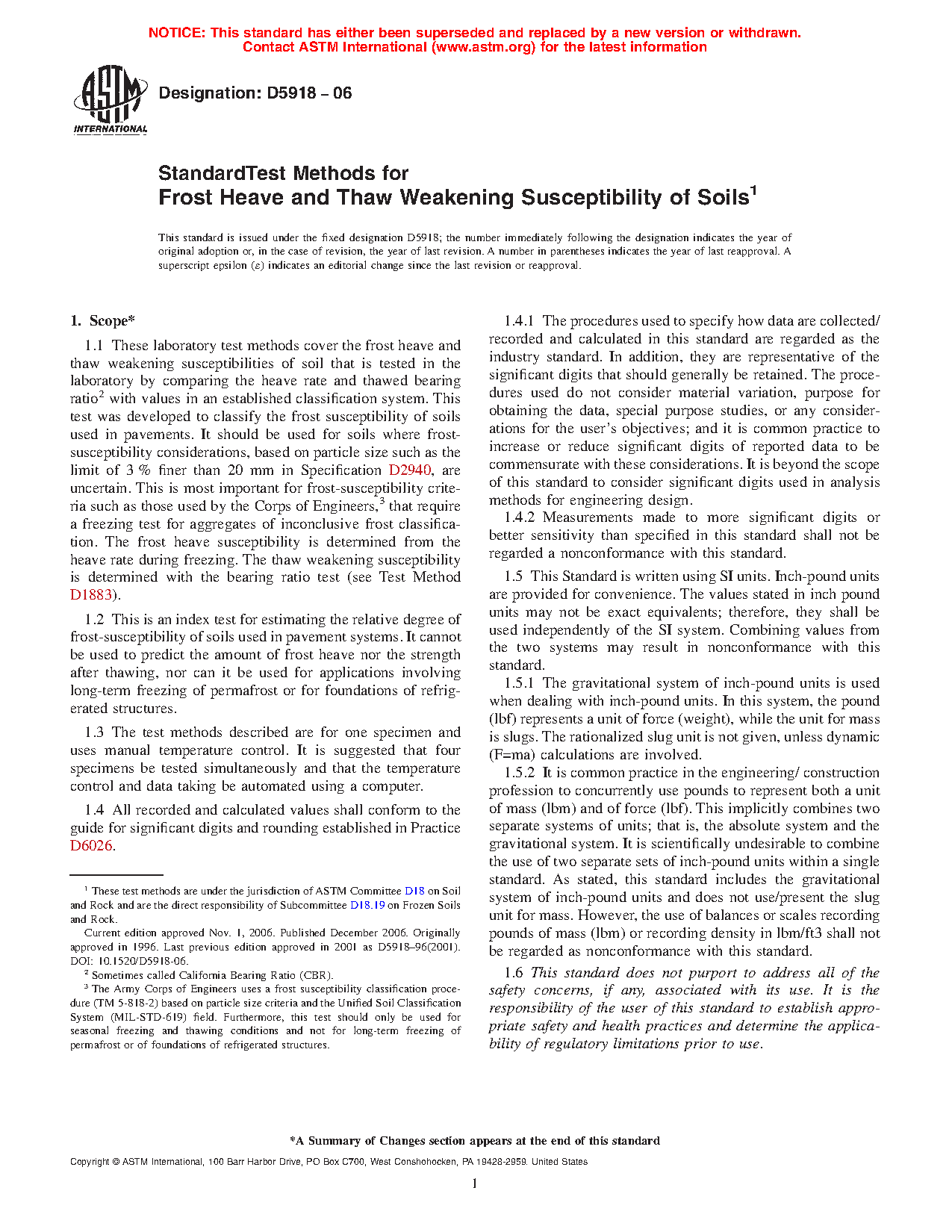 1.1 These laboratory test methods cover the frost heave and thaw weakening susceptibilities of soil that is tested in the laboratory by comparing the heave rate and thawed bearing ratio with values in an established classification system. This test was developed to classify the frost susceptibility of soils used in pavements. It should be used for soils where frost-susceptibility considerations, based on particle size such as the limit of 3 % finer than 20 mm in Specification D 2940, are uncertain. This is most important for frost-susceptibility criteria such as those used by the Corps of Engineers, that require a freezing test for aggregates of inconclusive frost classification. The frost heave susceptibility is determined from the heave rate during freezing. The thaw weakening susceptibility is determined with the bearing ratio test (see Test Method D1883).