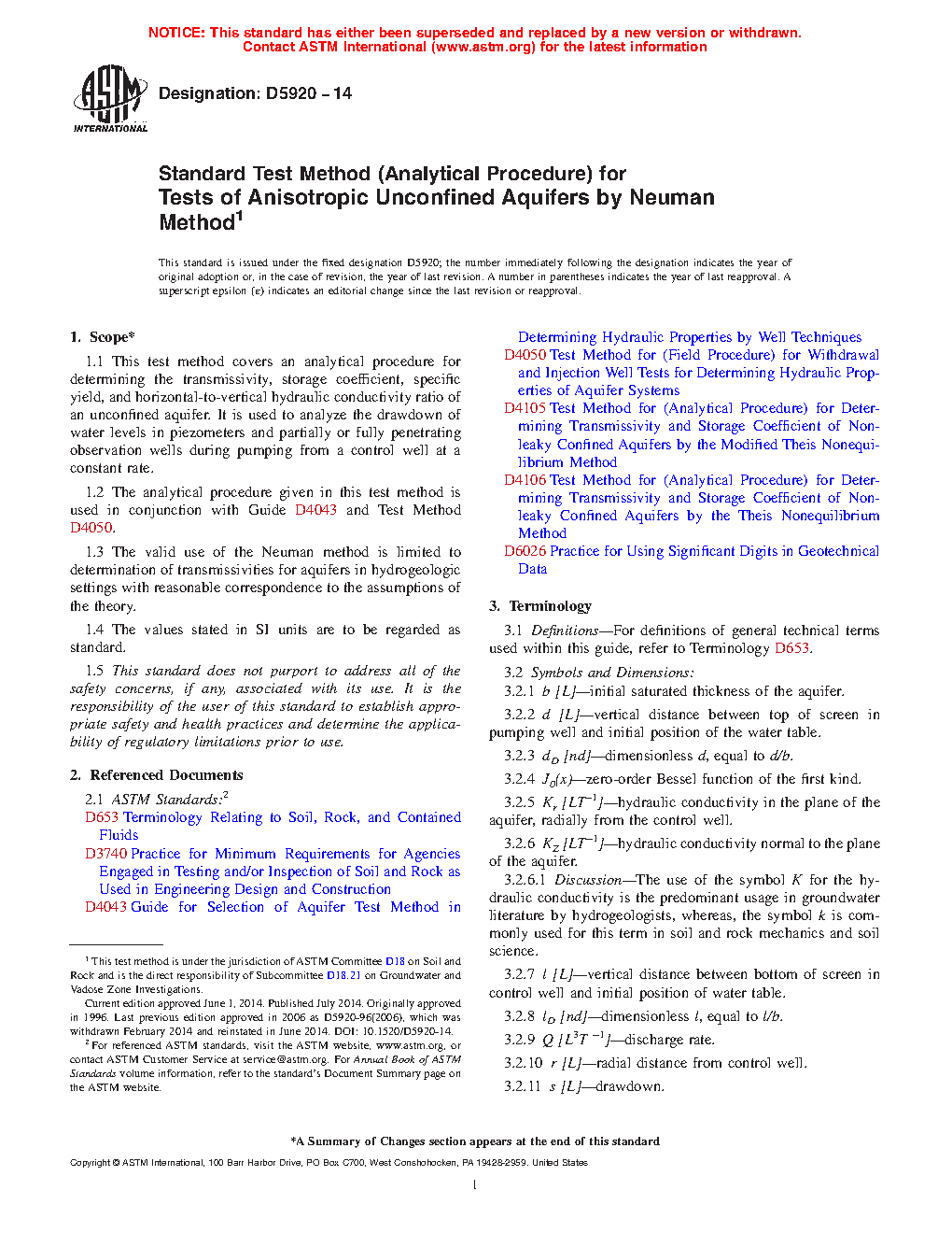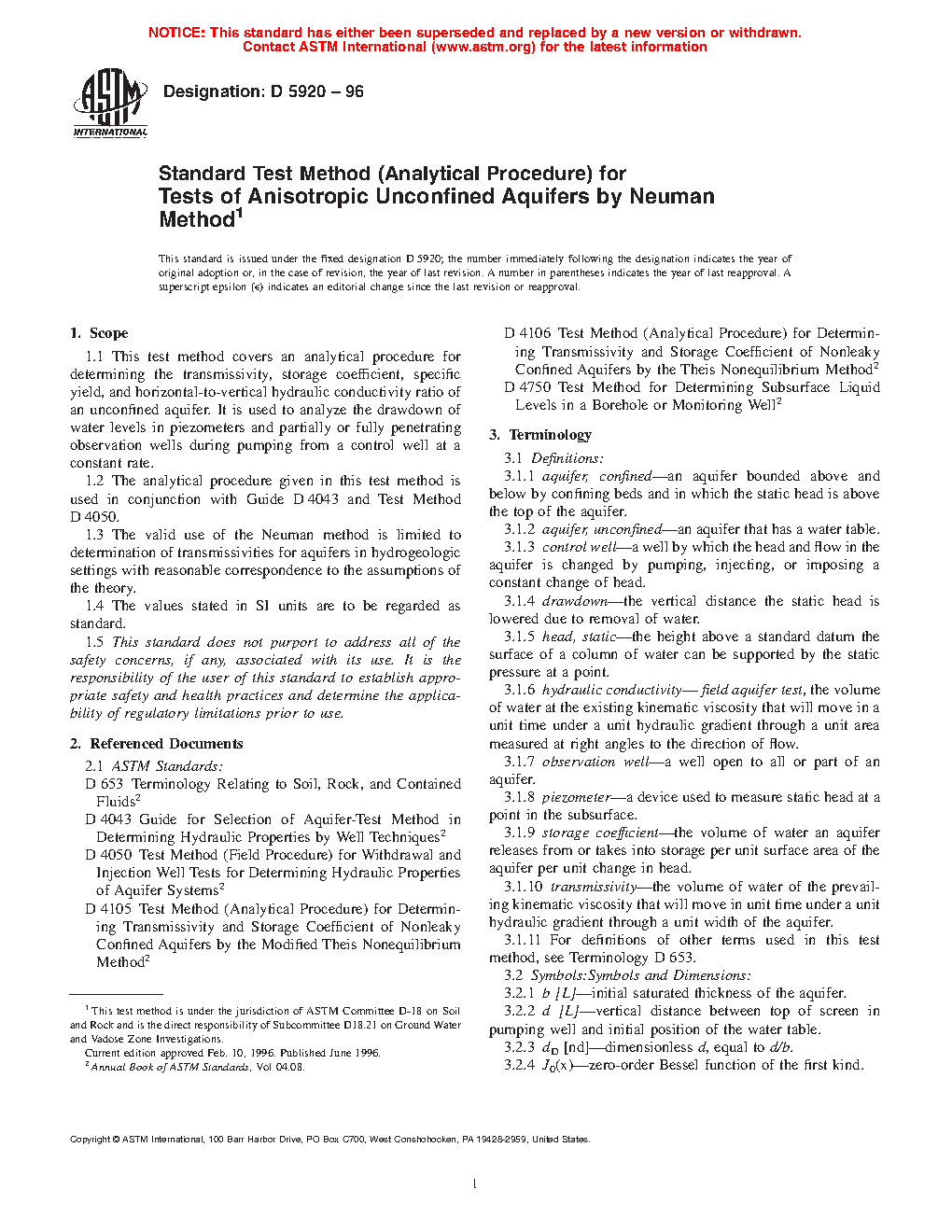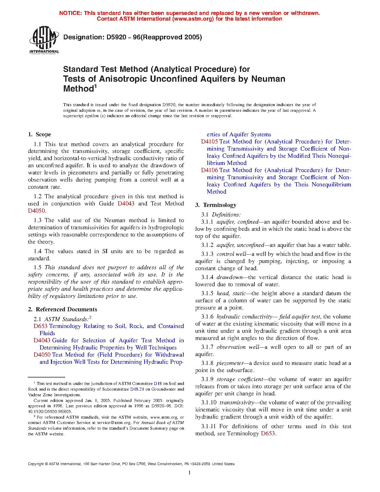 1.1 This test method covers an analytical procedure for determining the transmissivity, storage coefficient, specific yield, and horizontal-to-vertical hydraulic conductivity ratio of an unconfined aquifer. It is used to analyze the drawdown of water levels in piezometers and partially or fully penetrating observation wells during pumping from a control well at a constant rate.