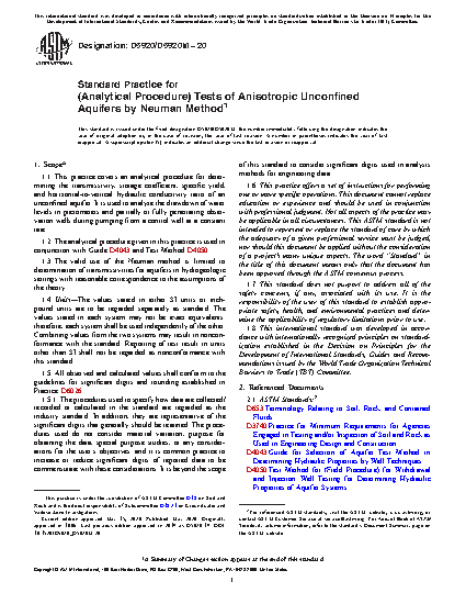 1.1 This practice covers an analytical procedure for determining the transmissivity, storage coefficient, specific yield, and horizontal-to-vertical hydraulic conductivity ratio of an unconfined aquifer. It is used to analyze the drawdown of water levels in piezometers and partially or fully penetrating observation wells during pumping from a control well at a constant rate.
