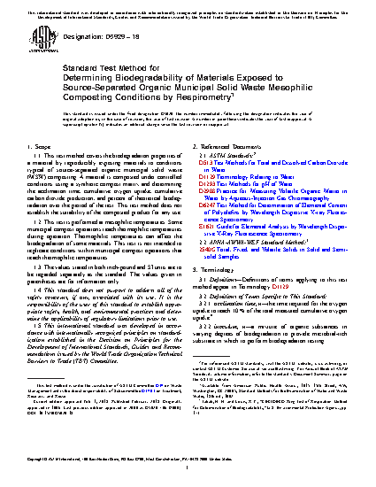 1.1 This test method covers the biodegradation properties of a material by reproducibly exposing materials to conditions typical of municipal solid waste (MSW) composting. A material is composted under controlled conditions using a synthetic compost matrix and determining the acclimation time, cumulative oxygen uptake, cumulative carbon dioxide production, and percent of theoretical biodegradation over the period of the test. This test method does not establish the suitability of the composted product for any use.