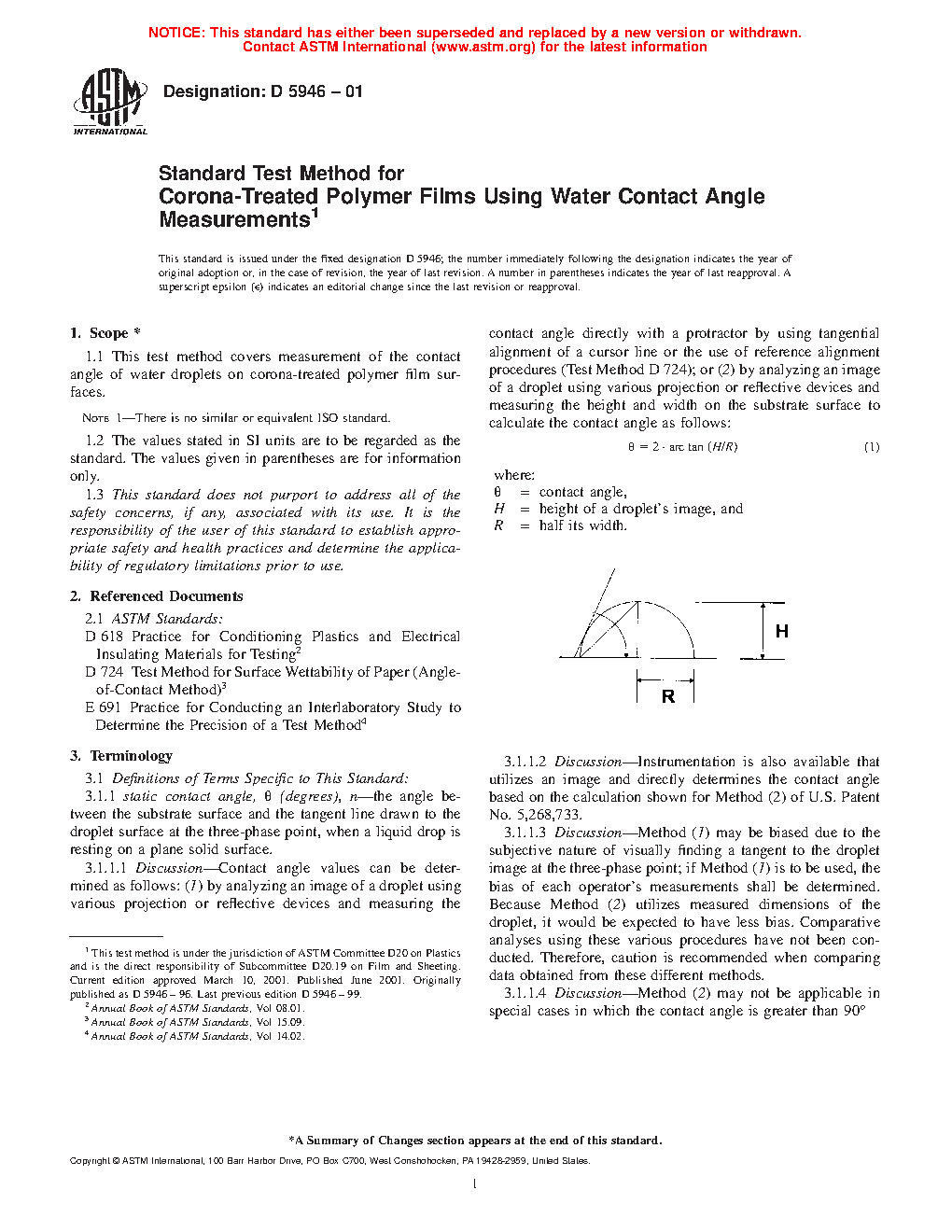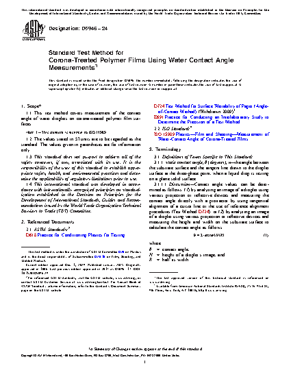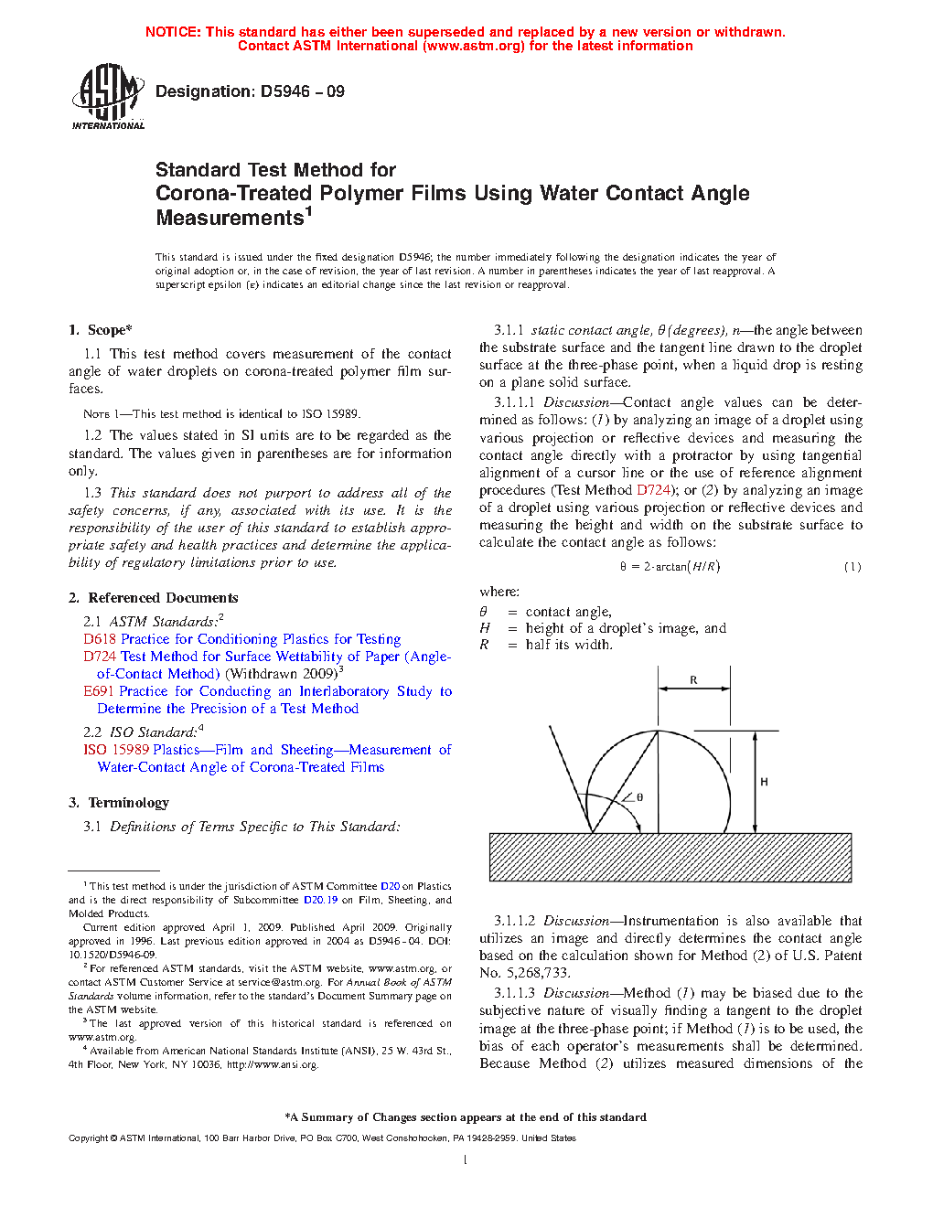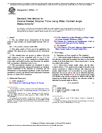 1.1 This test method covers measurement of the contact angle of water droplets on corona-treated polymer film surfaces.