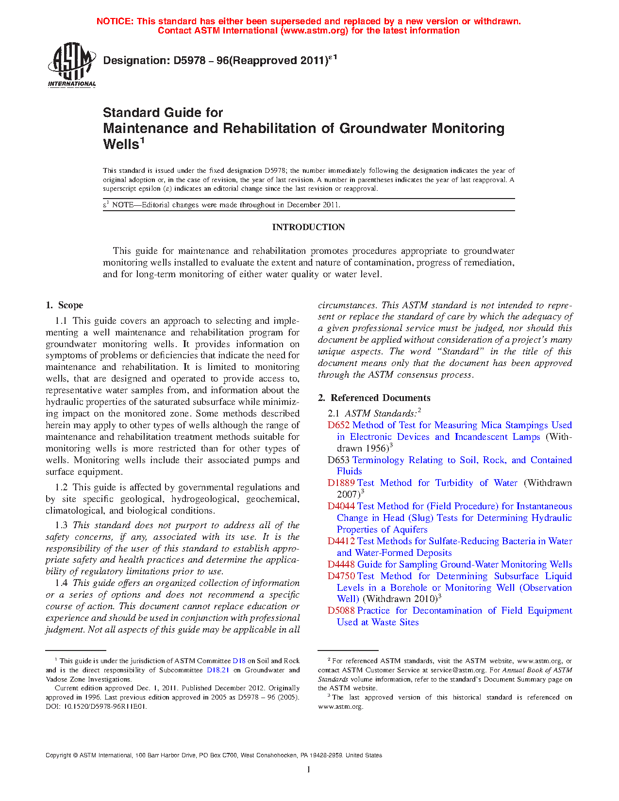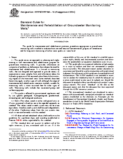 1.1 This guide covers an approach to selecting and implementing a well maintenance and rehabilitation program for groundwater monitoring wells. It provides information on symptoms of problems or deficiencies that indicate the need for maintenance and rehabilitation. It is limited to monitoring wells, that are designed and operated to provide access to, representative water samples from, and information about the hydraulic properties of the saturated subsurface while minimizing impact on the monitored zone. Some methods described herein may apply to other types of wells although the range of maintenance and rehabilitation treatment methods suitable for monitoring wells is more restricted than for other types of wells. Monitoring wells include their associated pumps and surface equipment.