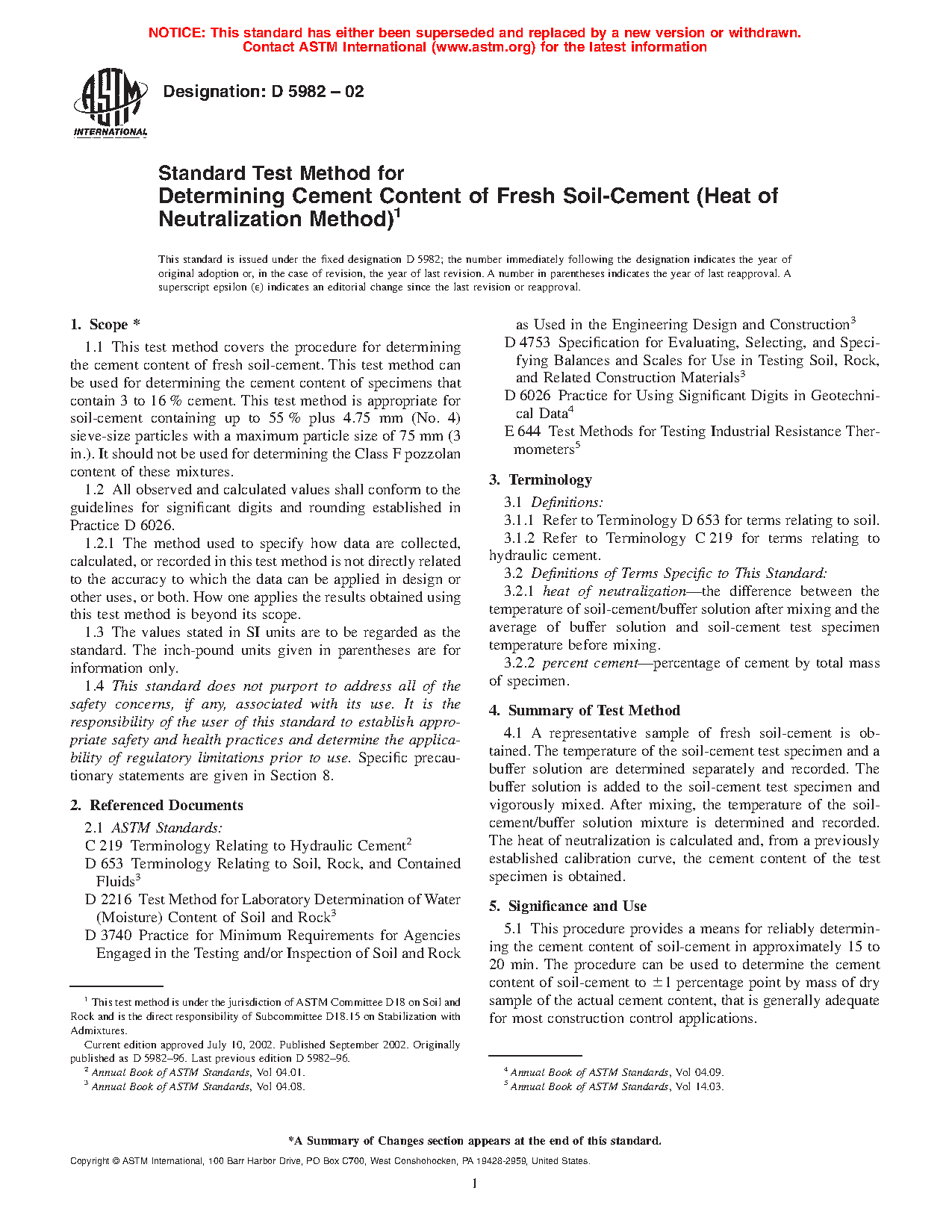 5.1 This procedure provides a means for reliably determining the cement content of soil-cement in approximately 15 to 20 min. The procedure can be used to determine the cement content of soil-cement to ±1 percentage point by mass of dry sample of the actual cement content, that is generally adequate for most construction control applications.