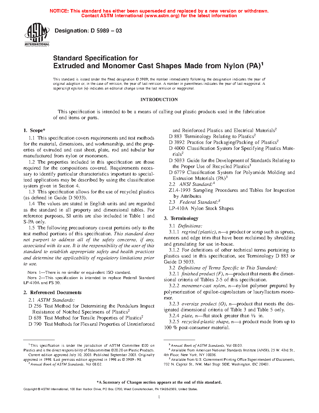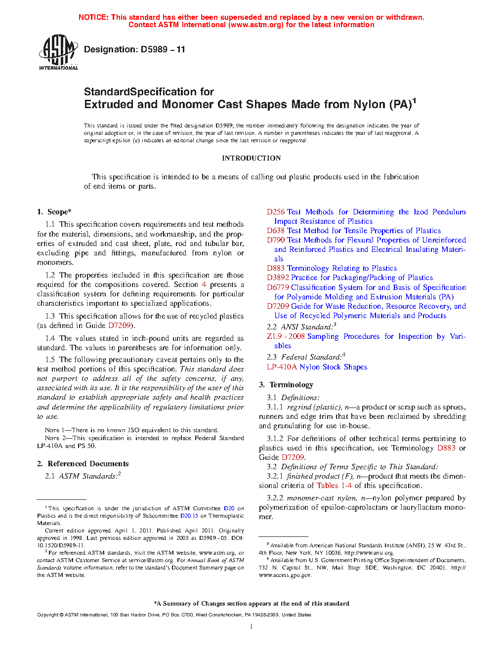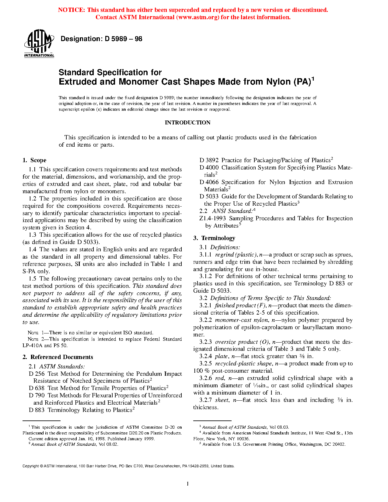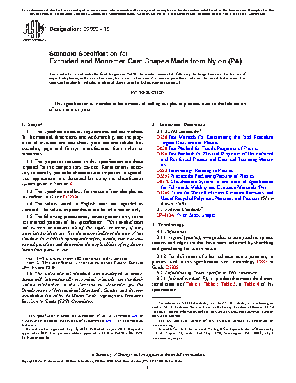 1.1 This specification covers requirements and test methods for the material, dimensions, and workmanship, and the properties of extruded and cast sheet, plate, rod and tubular bar manufactured from nylon or monomers.