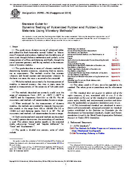 1.1 This guide covers dynamic testing of vulcanized rubber and rubber-like (both hereinafter termed “rubber” or “elastomeric”) materials and products, leading from the definitions of terms used, through the basic mathematics and symbols, to the measurement of stiffness and damping, and finally through the use of specimen geometry and flexing method, to the measurement of dynamic modulus.