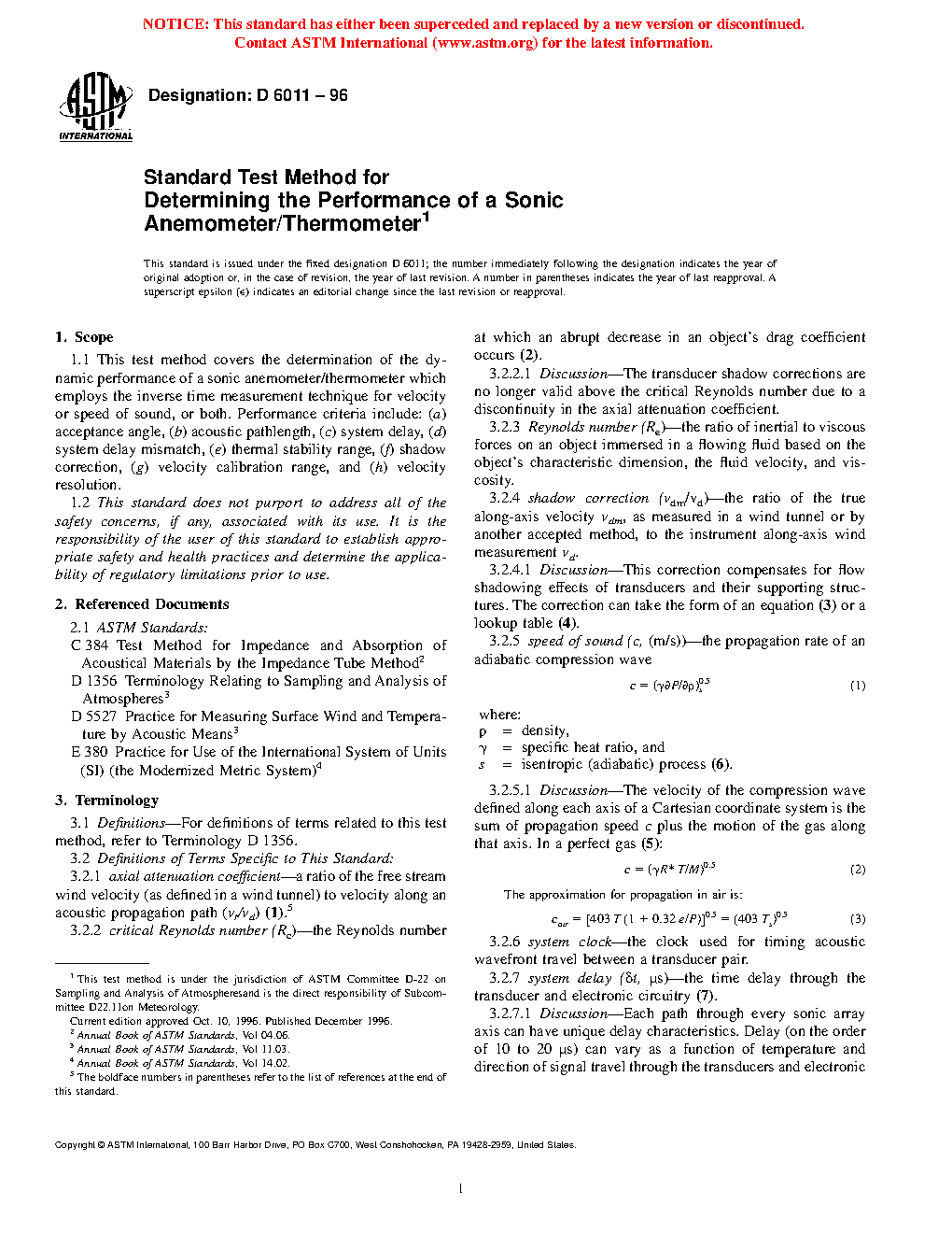 1.1 This test method covers the determination of the dynamic performance of a sonic anemometer/thermometer which employs the inverse time measurement technique for velocity or speed of sound, or both. Performance criteria include: (a) acceptance angle, (b) acoustic pathlength, (c) system delay, (d) system delay mismatch, (e) thermal stability range, (f) shadow correction, (g) velocity calibration range, and (h) velocity resolution.