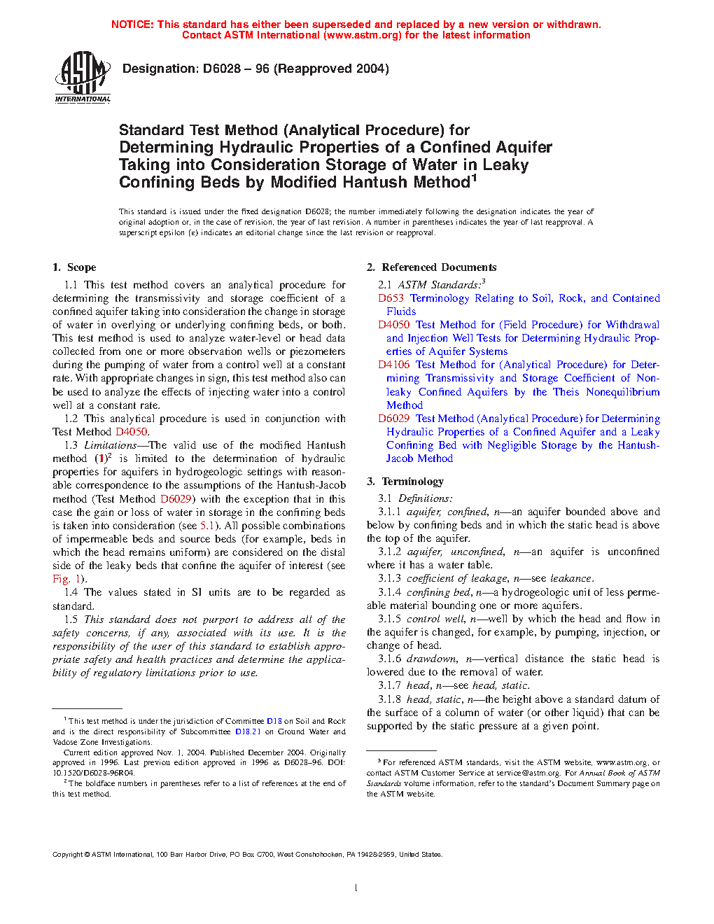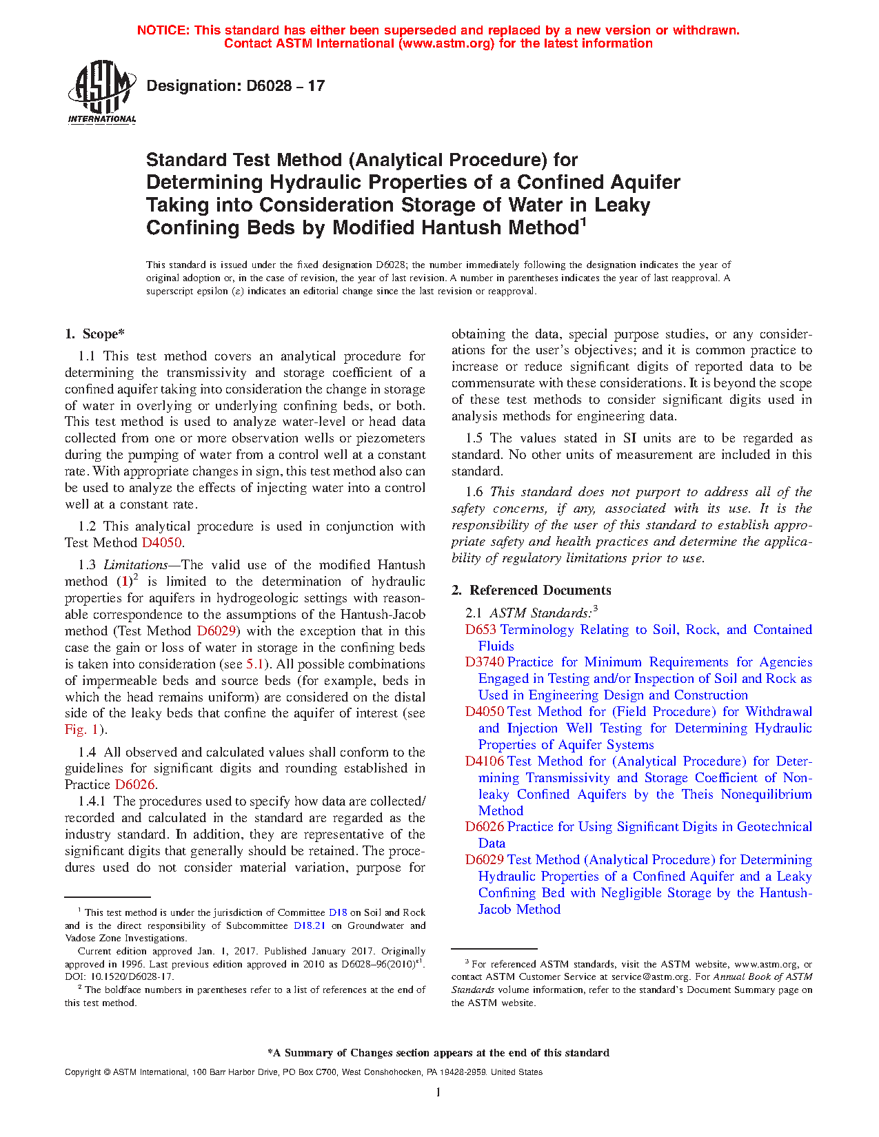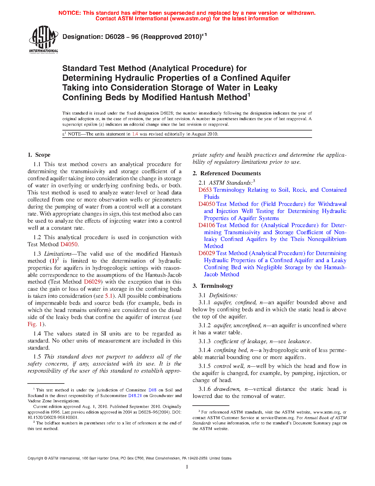 1.1 This test method covers an analytical procedure for determining the transmissivity and storage coefficient of a confined aquifer taking into consideration the change in storage of water in overlying or underlying confining beds, or both. This test method is used to analyze water-level or head data collected from one or more observation wells or piezometers during the pumping of water from a control well at a constant rate. With appropriate changes in sign, this test method also can be used to analyze the effects of injecting water into a control well at a constant rate.