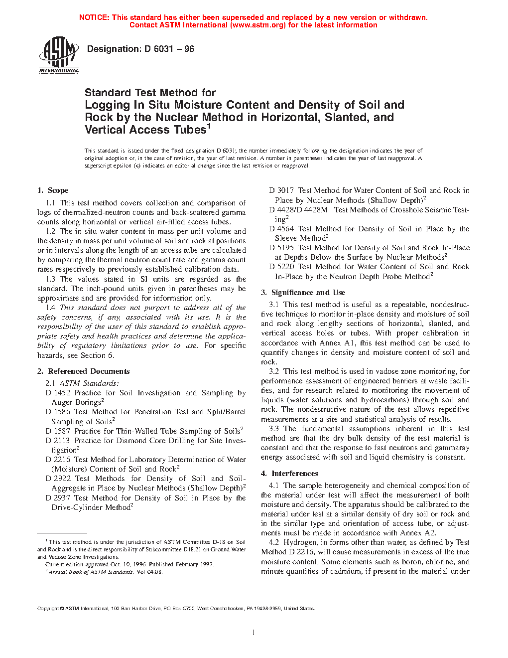 1.2 The in-situ water content in mass per unit volume and the density in mass per unit volume of soil and rock at positions or in intervals along the length of an access tube are calculated by comparing the thermal neutron count rate and gamma count rates respectively to previously established calibration data.