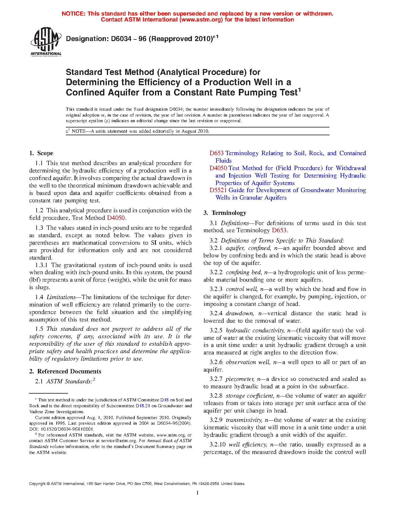 This test method allows the user to compute the true hydraulic efficiency of a pumped well in a confined aquifer from a constant rate pumping test. The procedures described constitute the only valid method of determining well efficiency. Some practitioners have confused well efficiency with percentage of head loss associated with laminar flow, a parameter commonly determined from a step-drawdown test. Well efficiency, however, cannot be determined from a step-drawdown test but only can be determined from a constant rate test.