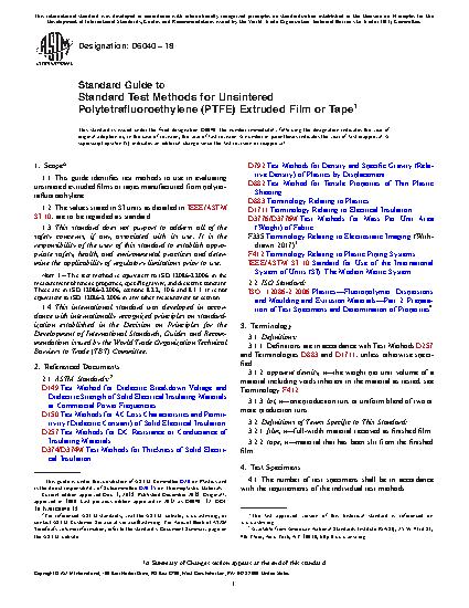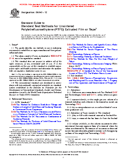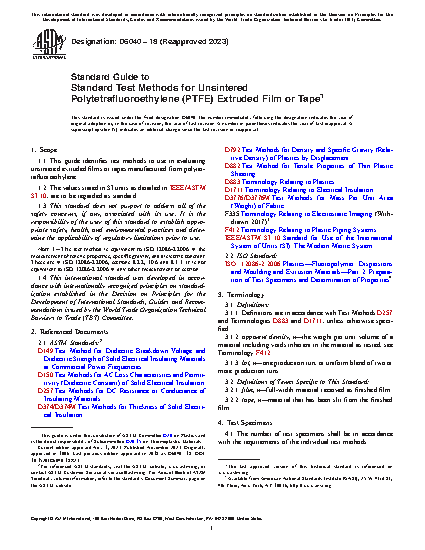 Standard Guide to Standard Test Methods for Unsintered Polytetrafluoroethylene (PTFE) Extruded Film or Tape