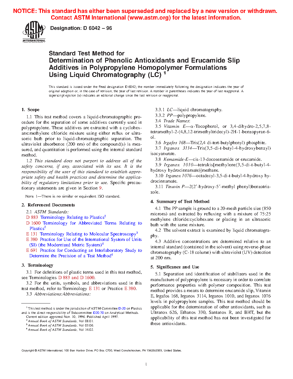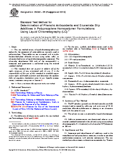 1.1 This test method covers a liquid-chromatographic procedure for the separation of some additives currently used in polypropylene. These additives are extracted with a cyclohexane:methylene chloride mixture using either reflux or ultrasonic bath prior to liquid-chromatographic separation. The ultraviolet absorbance (200 nm) of the compound(s) is measured, and quantitation is performed using the internal standard method.