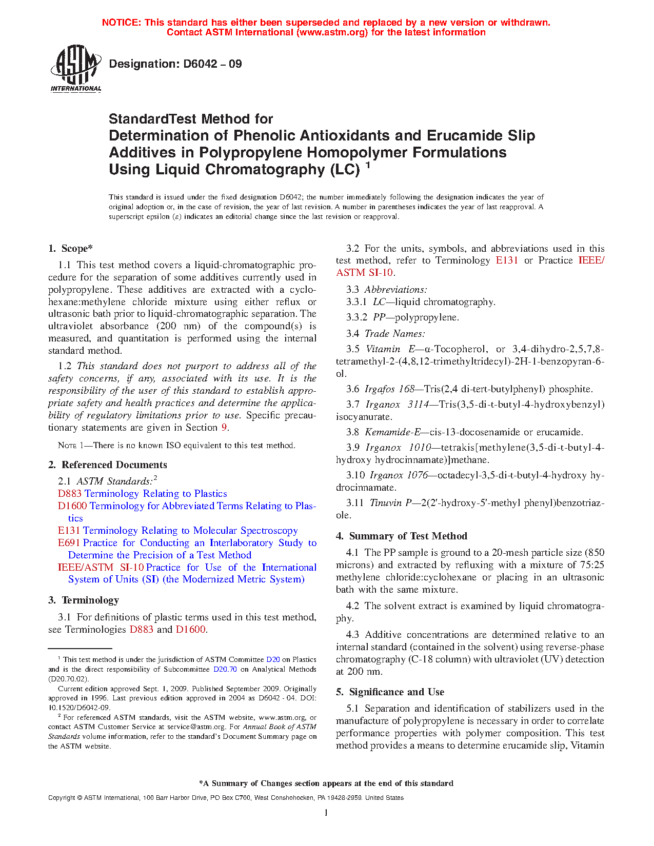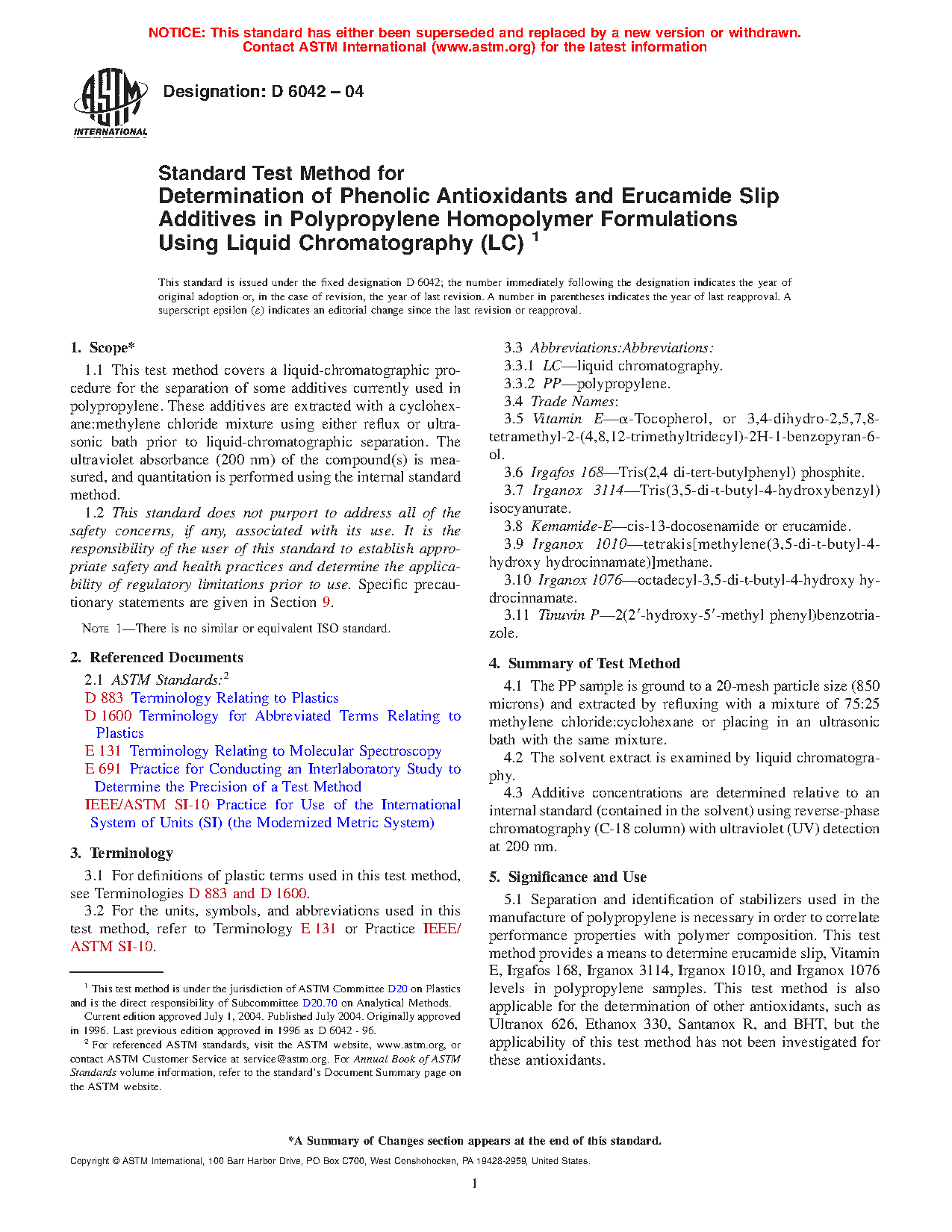 5.1 Separation and identification of stabilizers used in the manufacture of polypropylene is necessary in order to correlate performance properties with polymer composition. This test method provides a means to determine erucamide slip, Vitamin E, Irgafos 168, Irganox 3114, Irganox 1010, and Irganox 1076 levels in polypropylene samples. This test method is also applicable for the determination of other antioxidants, such as Ultranox 626, Ethanox 330, Santanox R, and BHT, but the applicability of this test method has not been investigated for these antioxidants.