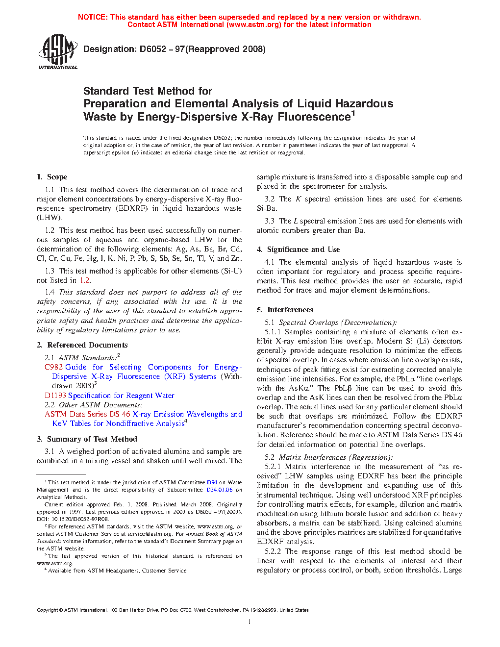 1.1 This test method covers the determination of trace and major element concentrations by energy-dispersive X-ray fluorescence spectrometry (EDXRF) in liquid hazardous waste (LHW).