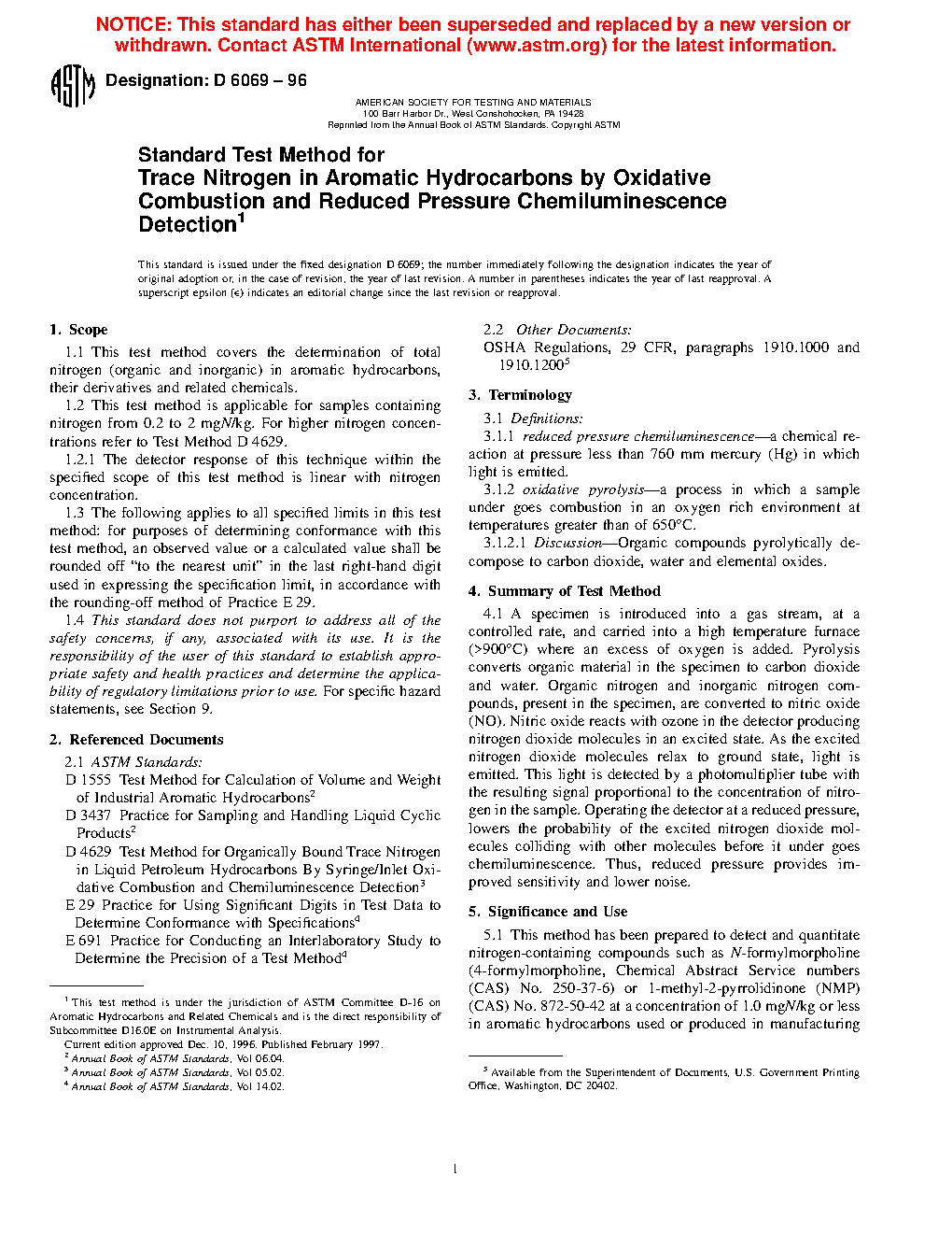 This method has been prepared to detect and quantitate nitrogen-containing compounds such as N-formylmorpholine (4-formylmorpholine, Chemical Abstract Service numbers (CAS) No. 250-37-6) or 1-methyl-2-pyrrolidinone (NMP) (CAS) No. 872-50-42 at a concentration of 1.0 mgN/kg or less in aromatic hydrocarbons used or produced in manufacturing processes. These nitrogen-containing compounds are undesirable in the finished aromatic products and may be the result of the aromatic extraction process. This test method may be used in setting specifications for determining the total nitrogen content in aromatic hydrocarbons.