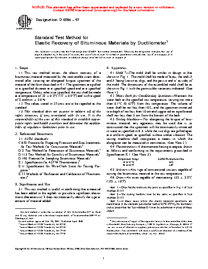 1.1 This test method covers the elastic recovery of a bituminous material measured by the recoverable strain determined after severing an elongated briquet specimen of the material of the form described in 4.1. The specimens are pulled to a specified distance at a specified speed and at a specified temperature. Unless otherwise specified, the test shall be made at a temperature of 25 + or - 0.5°C (77 + or - 0.9°F) and with a speed of 5 cm/min + or - 5.0%.