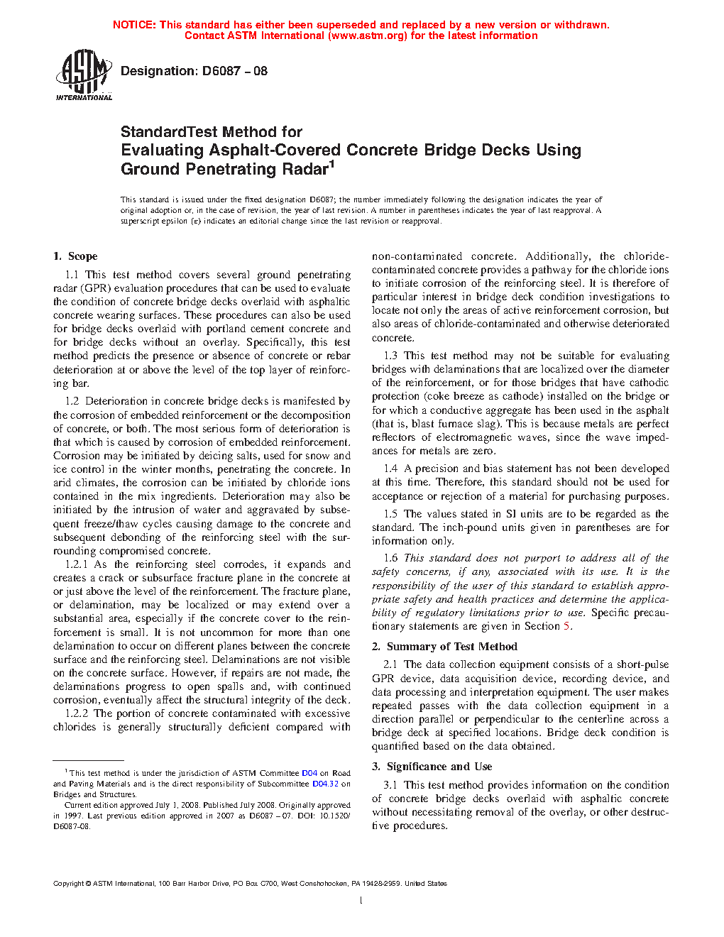 1.2.2 The portion of concrete contaminated with excessive chlorides is generally structurally deficient compared with non-contaminated concrete. Additionally, the chloride-contaminated concrete provides a pathway for the chloride ions to initiate corrosion of the reinforcing steel. It is therefore of particular interest in bridge deck condition investigations to locate not only the areas of active reinforcement corrosion, but also areas of chloride-contaminated and otherwise deteriorated concrete.