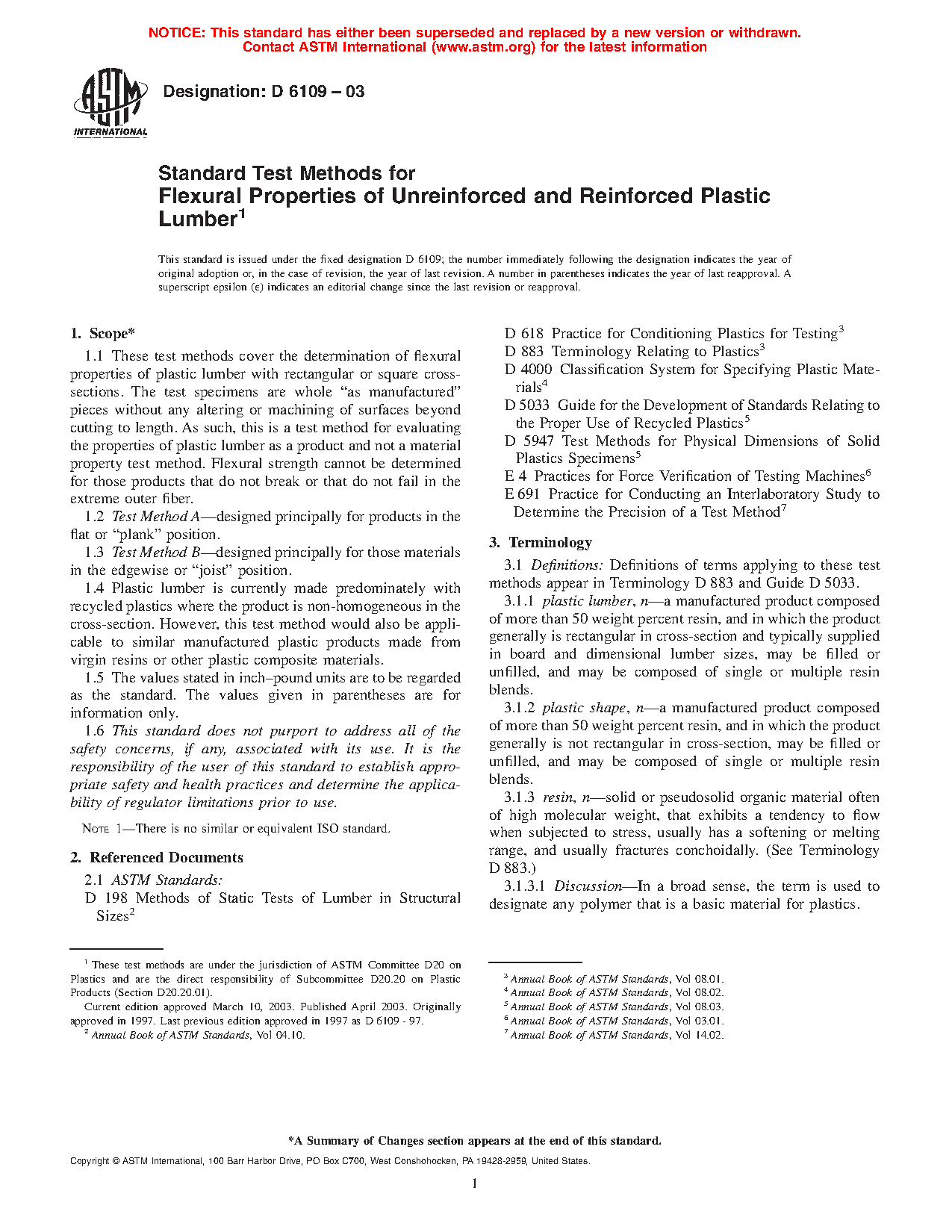 1.4 Plastic lumber is currently made predominately with recycled plastics where the product is non-homogeneous in the cross-section. However, this test method would also be applicable to similar manufactured plastic products made from virgin resins or other plastic composite materials.