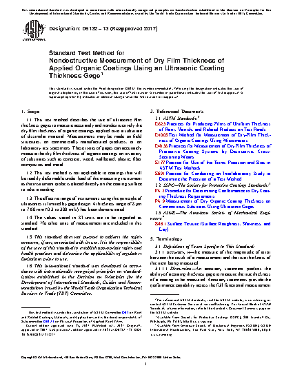 1.1 This test method describes the use of ultrasonic film thickness gages to measure accurately and nondestructively the dry film thickness of organic coatings applied over a substrate of dissimilar material. Measurements may be made on field structures, on commercially manufactured products, or on laboratory test specimens. These types of gages can accurately measure the dry film thickness of organic coatings on a variety of substrates such as concrete, wood, wallboard, plastic, fiber composites and metal.
