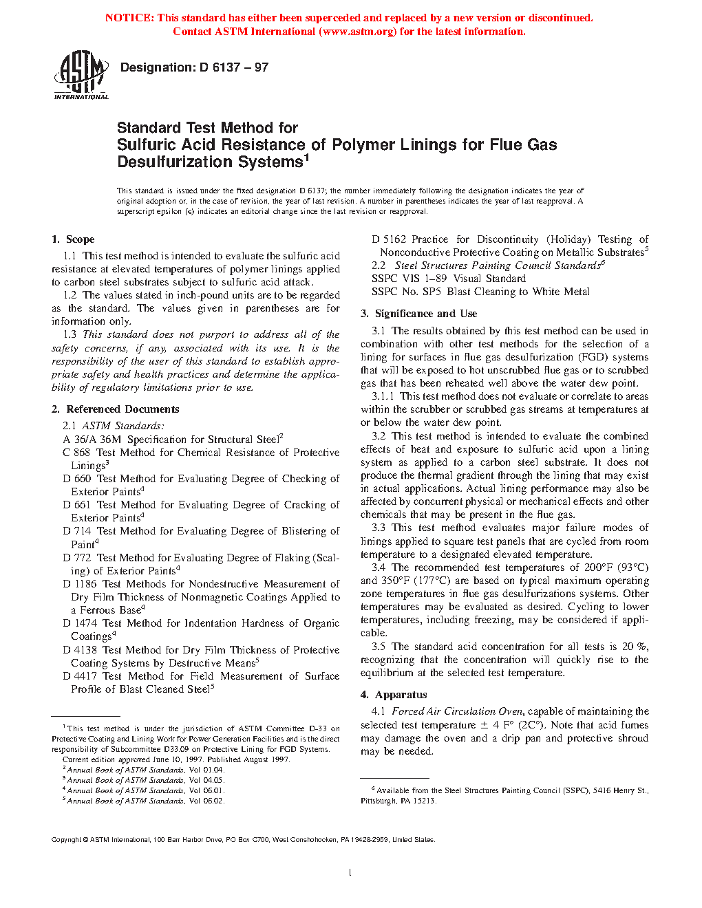 1.1 this test method is intended to evaluate the sulfuric acid resistance at elevated temperatures of polymer linings applied to carbon steel substrates subject to sulfuric acid attack.