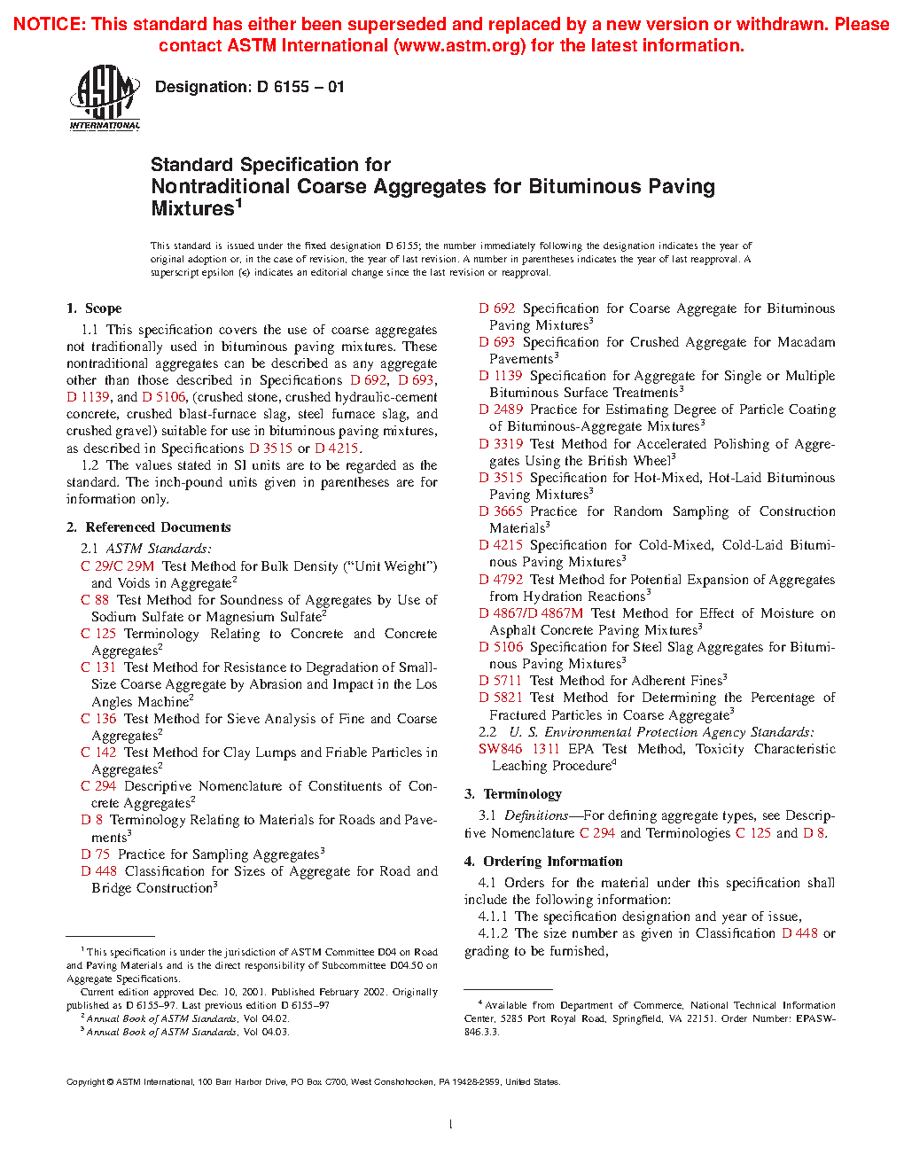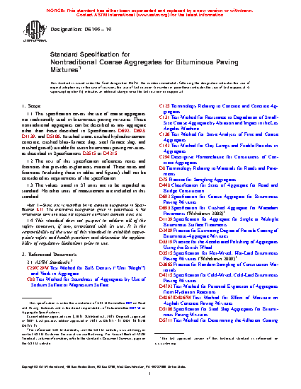 1.1 This specification covers the use of coarse aggregates not traditionally used in asphalt paving mixtures. These nontraditional aggregates can be described as any aggregate other than those described in Specifications D692/D692M, D693, D1139/D1139M, and D5106 (crushed stone, crushed hydraulic cement concrete, crushed blast-furnace slag, steel furnace slag, and crushed gravel) suitable for use in asphalt paving mixtures, as described in Specification D3515 or D4215.