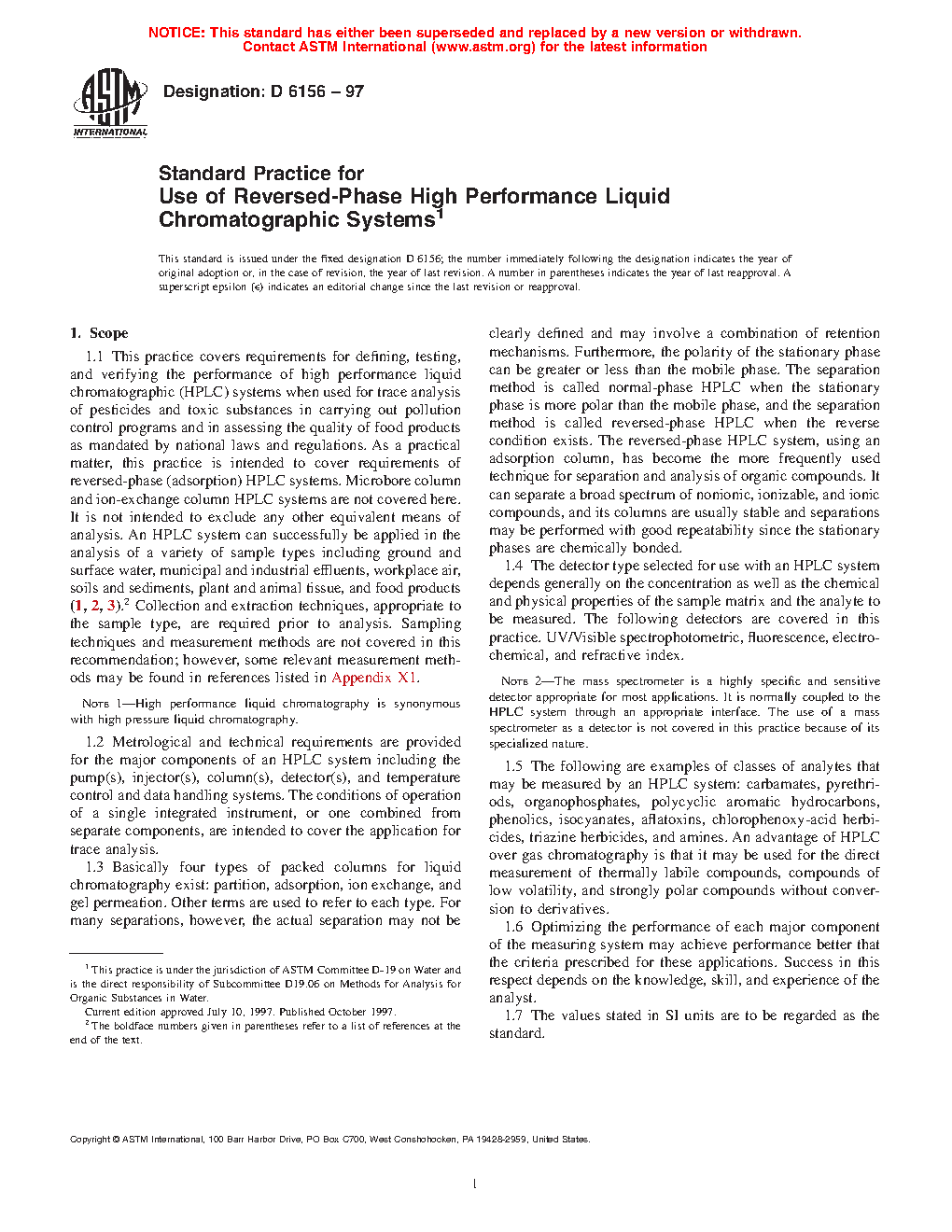 1.1 This practice covers requirements for defining, testing, and verifying the performance of high performance liquid chromatographic (HPLC) systems when used for trace analysis of pesticides and toxic substancesin carrying out pollution control programs and in assessing the quality of food products as mandated by national laws and regulations. As a practical matter, this practice is intended to cover requirements of reversed-phase (adsorption) HPLC systems. Microbore column and ion-exchange column HPLC systems are not covered here. It is not intended to exclude any other equivalent means of analysis. An HPLC system can successfully be applied in the analysis of a variety of sample types including ground and surface water, municipal and industrial effluents, workplace air, soils and sediments, plant abd animal tissue, and food products. Collection and extraction techniques , appropriate to the sample type, are required prior to analysis. Sampling techniques and measurement methods are not covered in this recommendation; however, some relevant measurement methods may be found in references listed in Appendix X1.